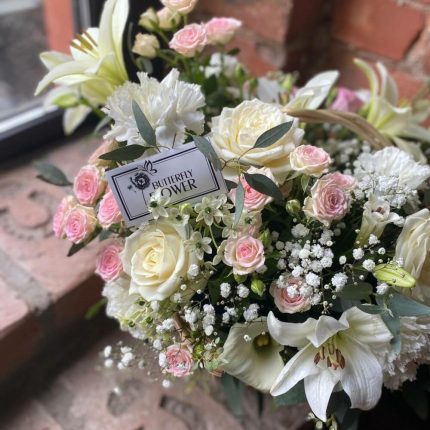 Букет из лилий, гортензии, эустомы, роз, гвоздики и гипсофилы в корзине “Карндона”