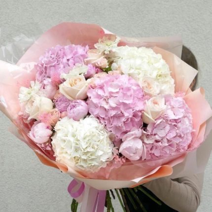 Букет из гортензий, диантусов, самшита, цимбидиума, роз, эустомы и лимониума в стильной упаковке “Сидней”