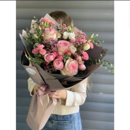 Шляпная коробка гортензией, пионами, эустомой, тюльпанами, гиацинтами, фрезией и гвоздикой “Джоанна”