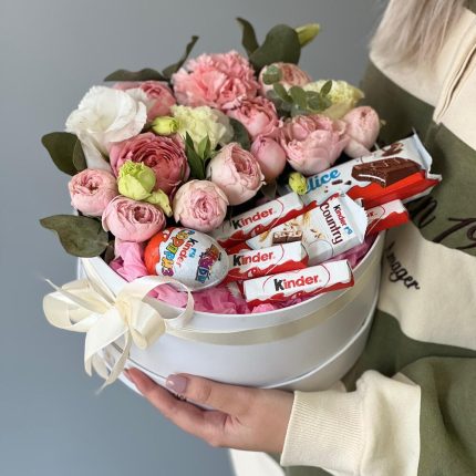 Пышный нежный и ароматный букет “Рассвет в любви” с розами, эвкалиптом, лизиантусом и генистой