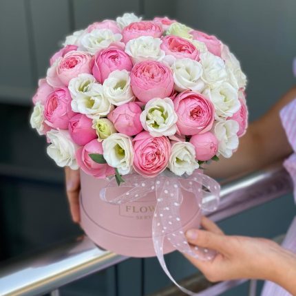 Коробка Тоскана из эустомы, кустовых и одноголовых роз, диантуса и альстромерии