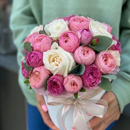 mono bouquet 88 из 25 кустовых пионовидных роз сорта madam bombastic и эвкалипта