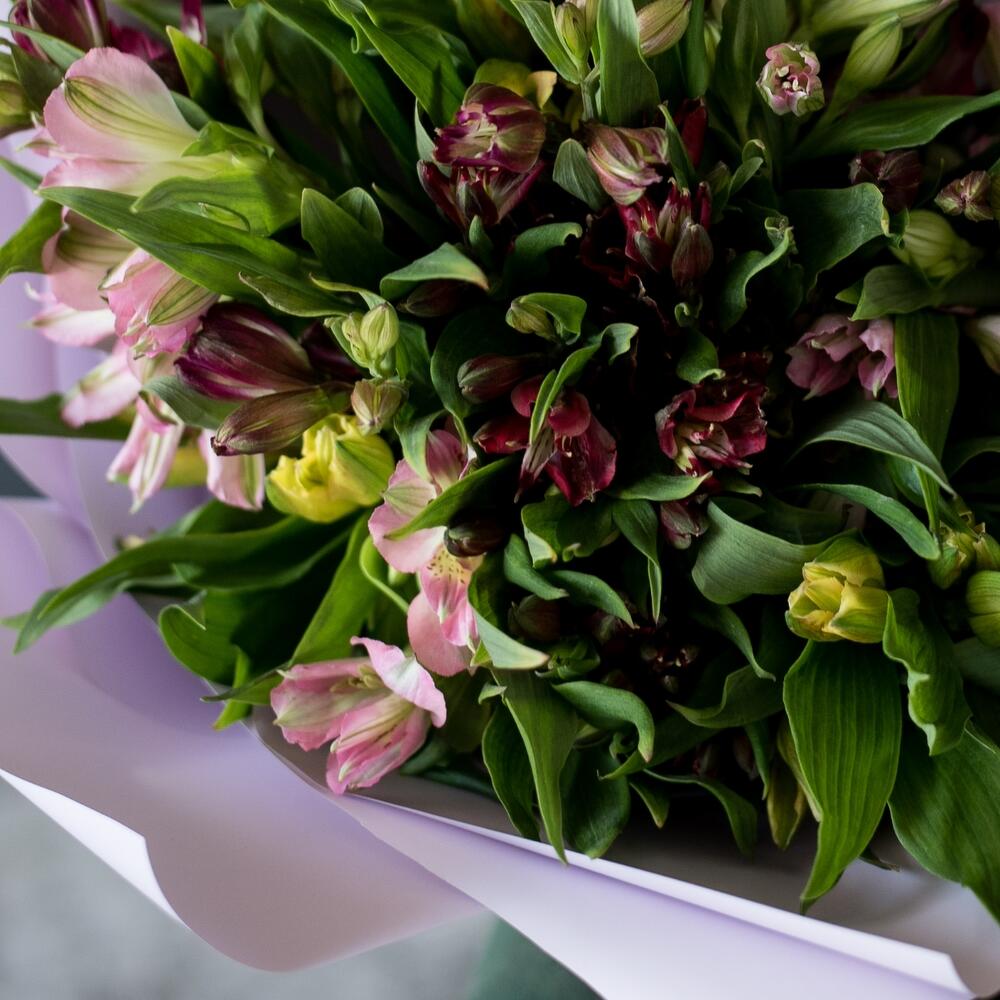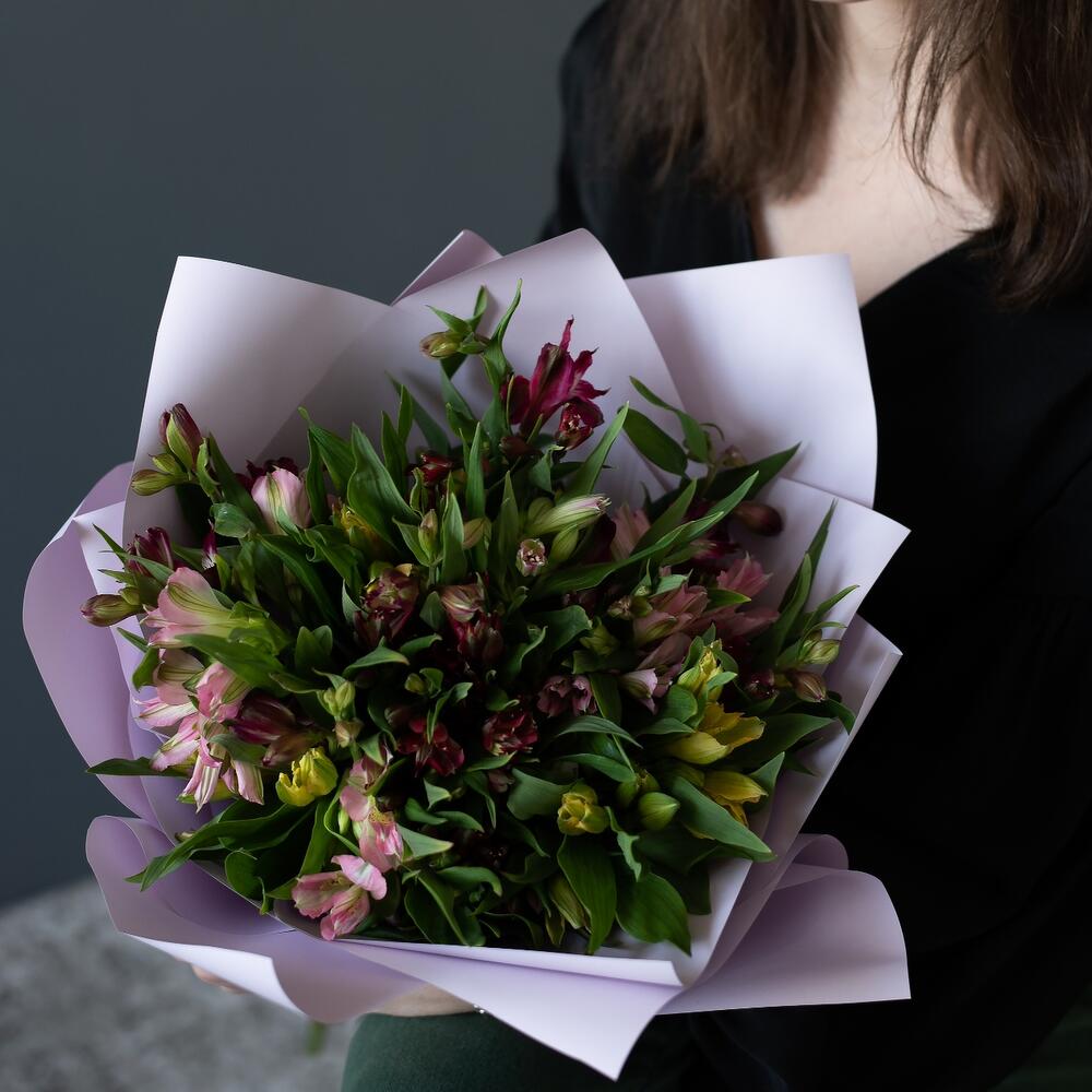 Альстромерия – 15 шт.Матовая упаковка – 2 шт.Лента атласная – 2 шт.