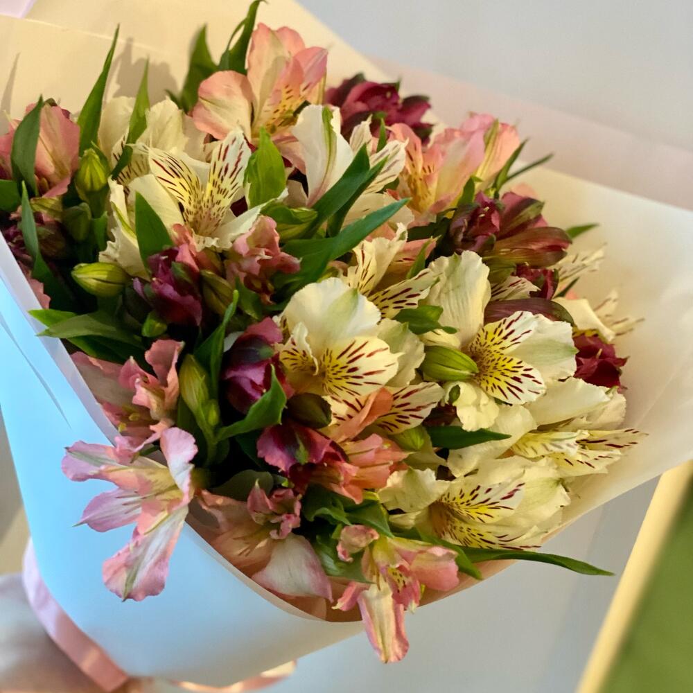 Альстромерия – 15 шт.Лента атласная – 1 шт.Дизайнерская упаковка – 3 шт.