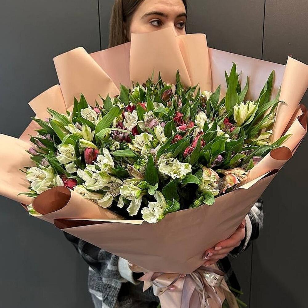 Альстромерия – 45 шт.Лента атласная – 1 шт.Упаковка матовая – 1 шт.
