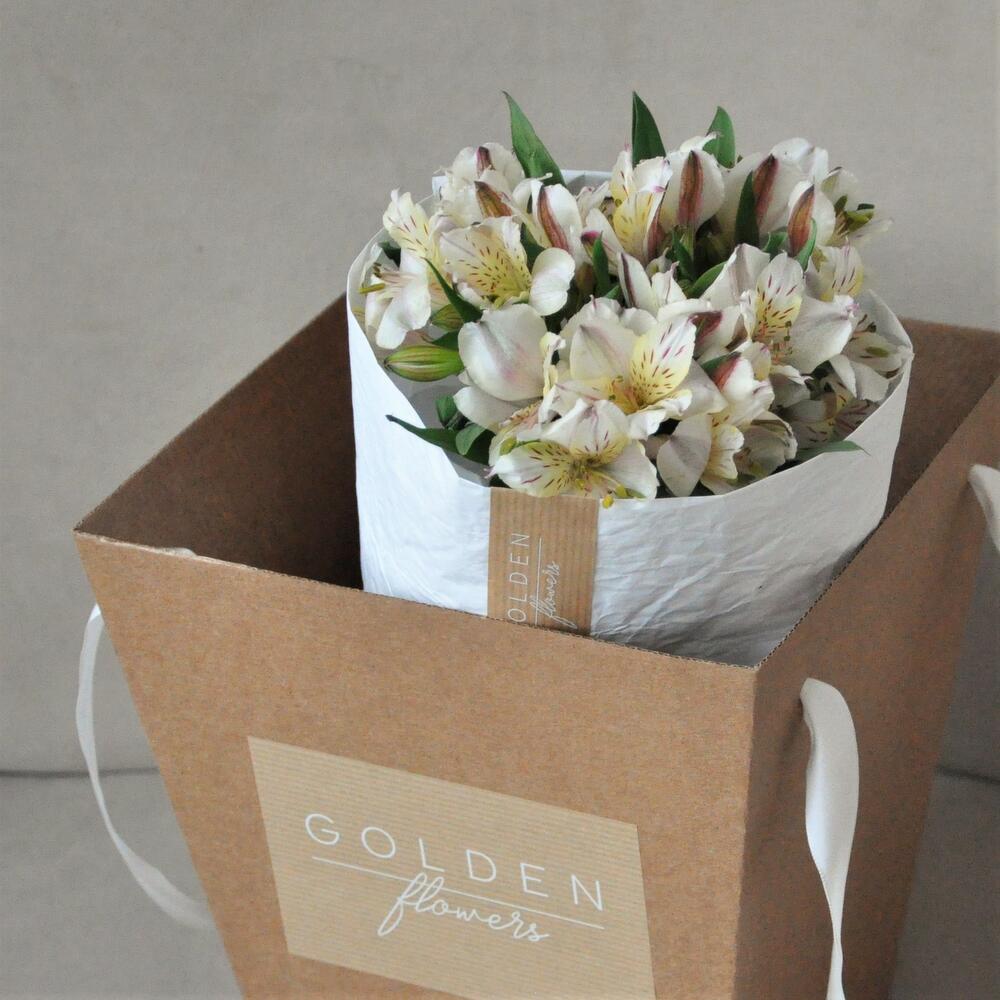 Яркая коробка из роз и альстельмерии порадует Вас и ваших близких