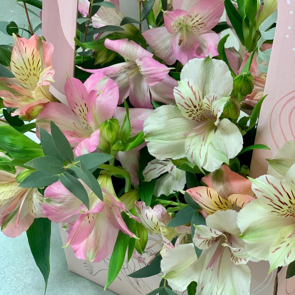 Коробка с альстромерией и зеленью