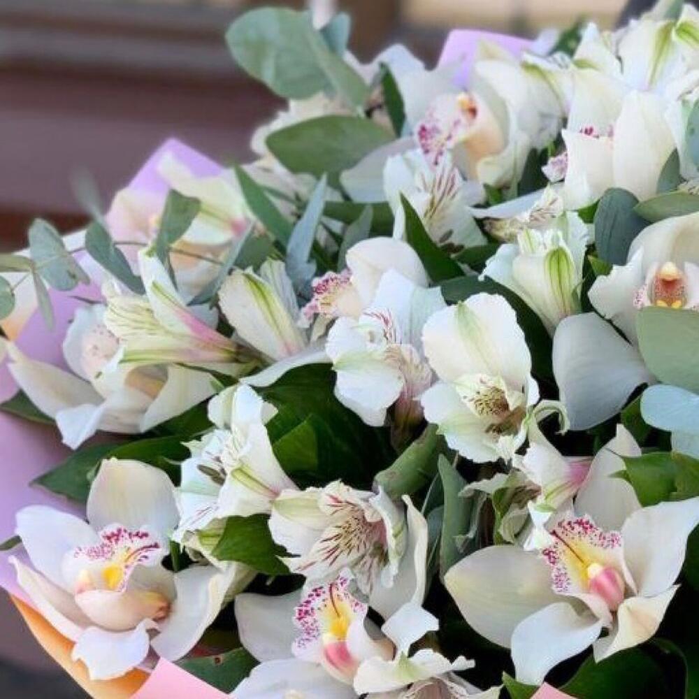 Орхидея Цимбидиум ветка – 1 шт.Альстромерия – 7 шт.Эвкалипт – 5 шт.Зелень – 15 шт.Упаковка дизайнерская – 3 шт.