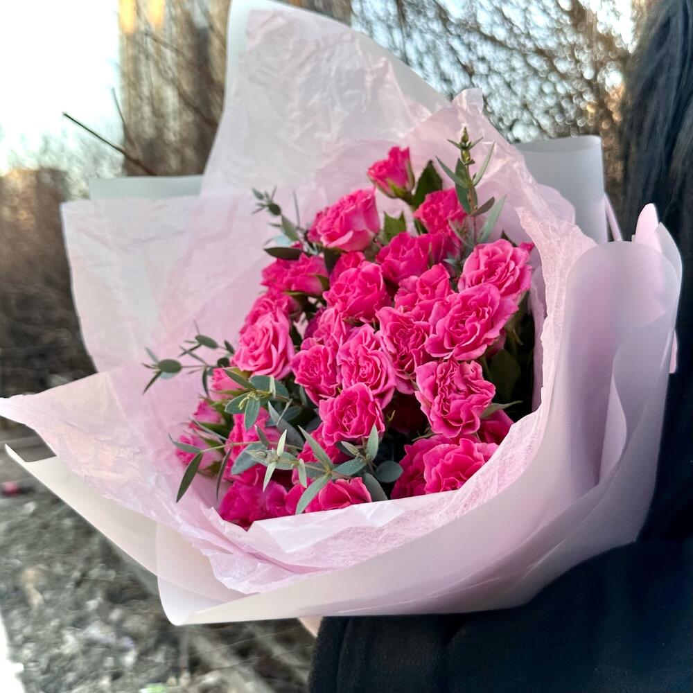 11 розовых кустовых роз с эвкалиптом