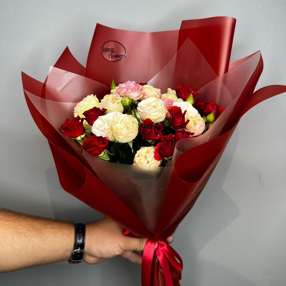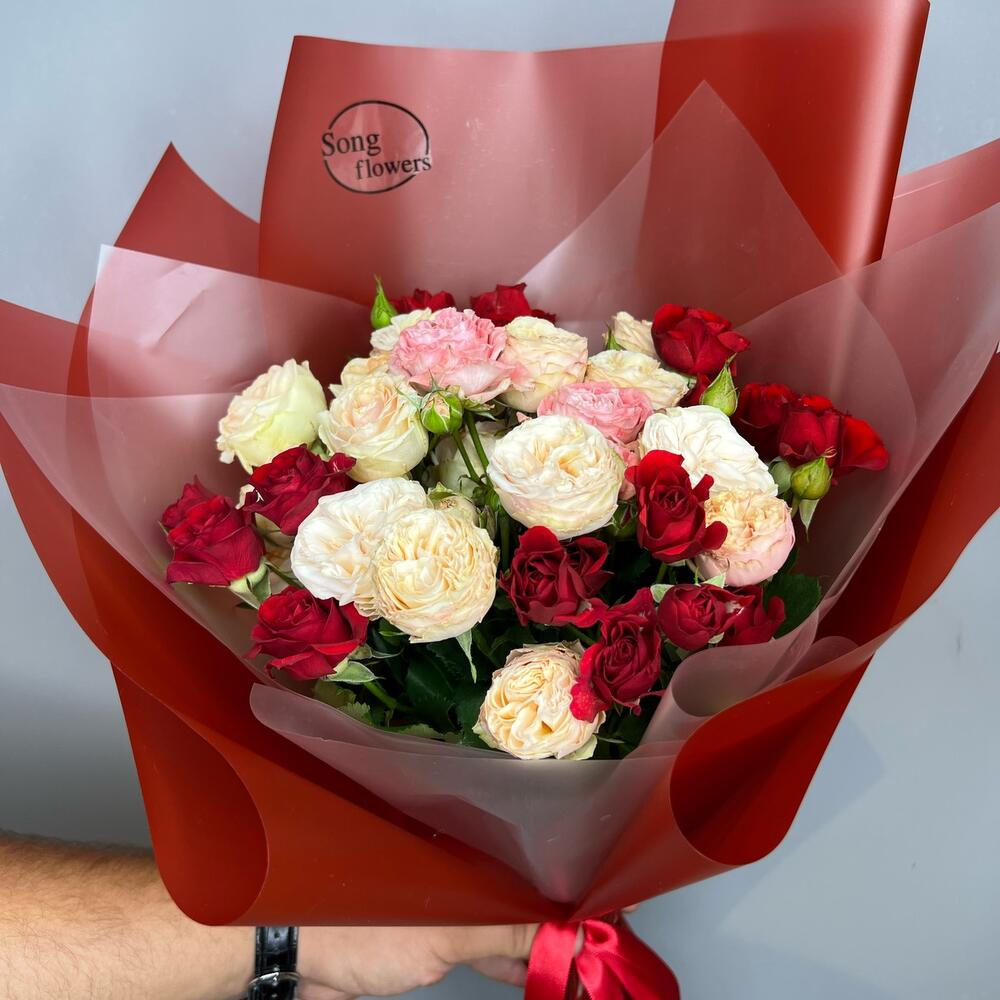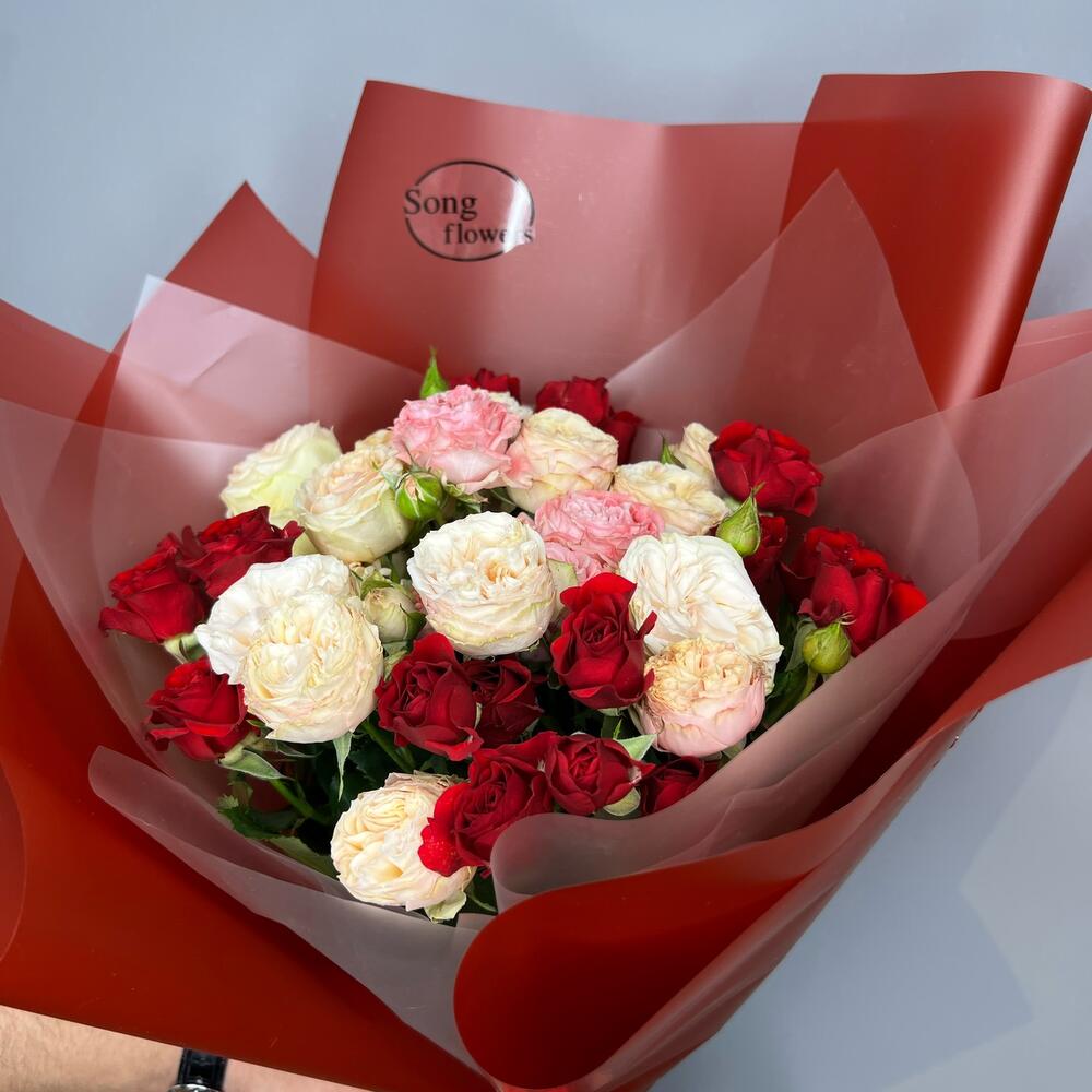 Гвоздики, Кустовые розы, Лизиантусы, Пионовидные розы, Розы