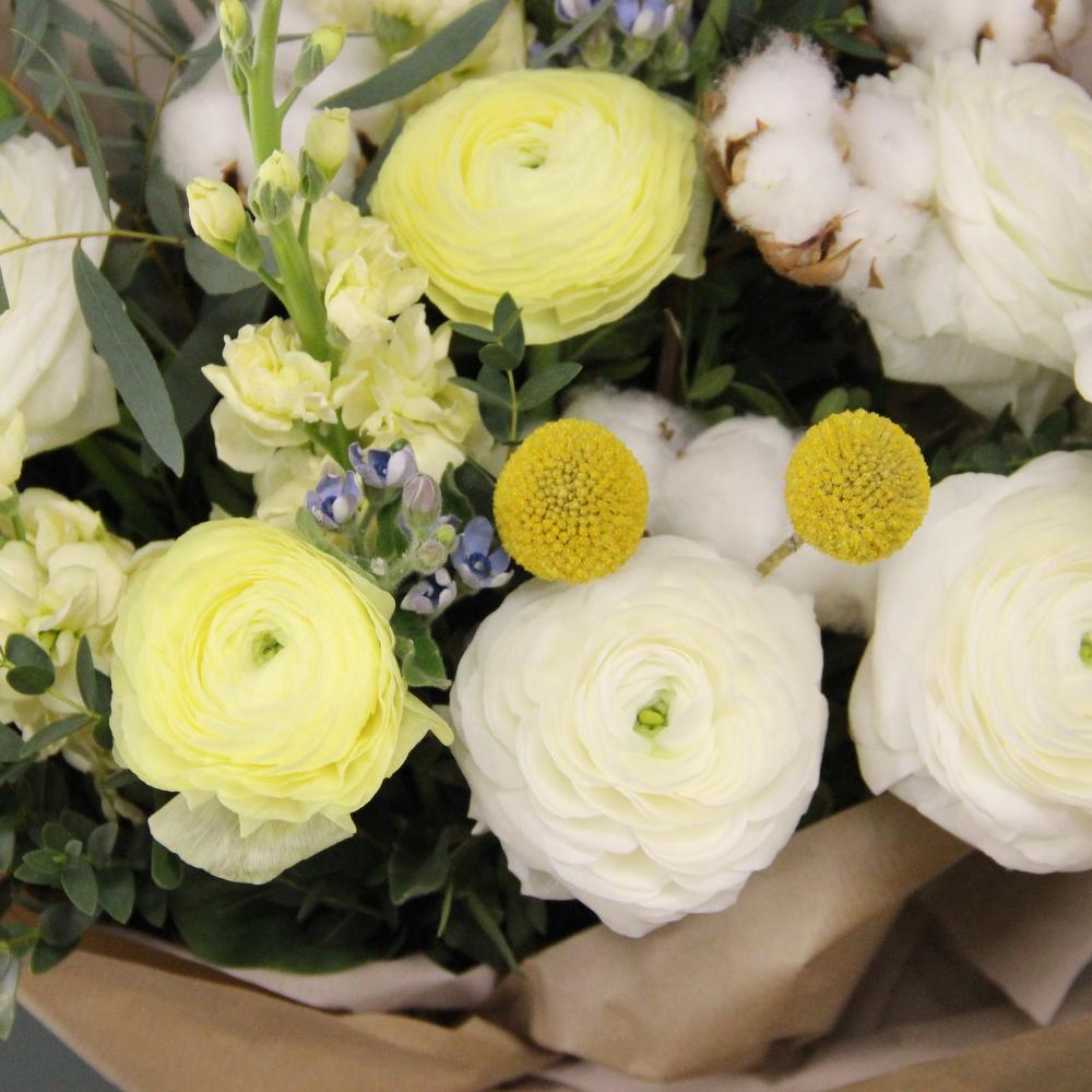 Авторский букет с ранункулюсами, ароматной маттиолой, твидией, хлопком, эвкалиптом, краспедией и амарантом.Ширина букета около 50 сантиметров, высота букета около 60 сантиметров.Стильное цветочное решение для любого случая.Отличный выбор для подарка на день всех влюблённых, 14 февраля.
