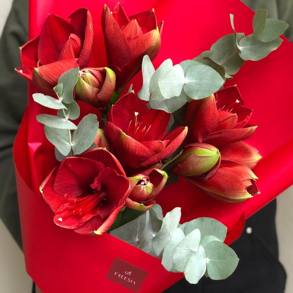 амариллис красный – 3 шт.Эвкалипт – 5 шт.Дизайнерская упаковка – 1 шт.транспортировочная упаковка – 1 шт.