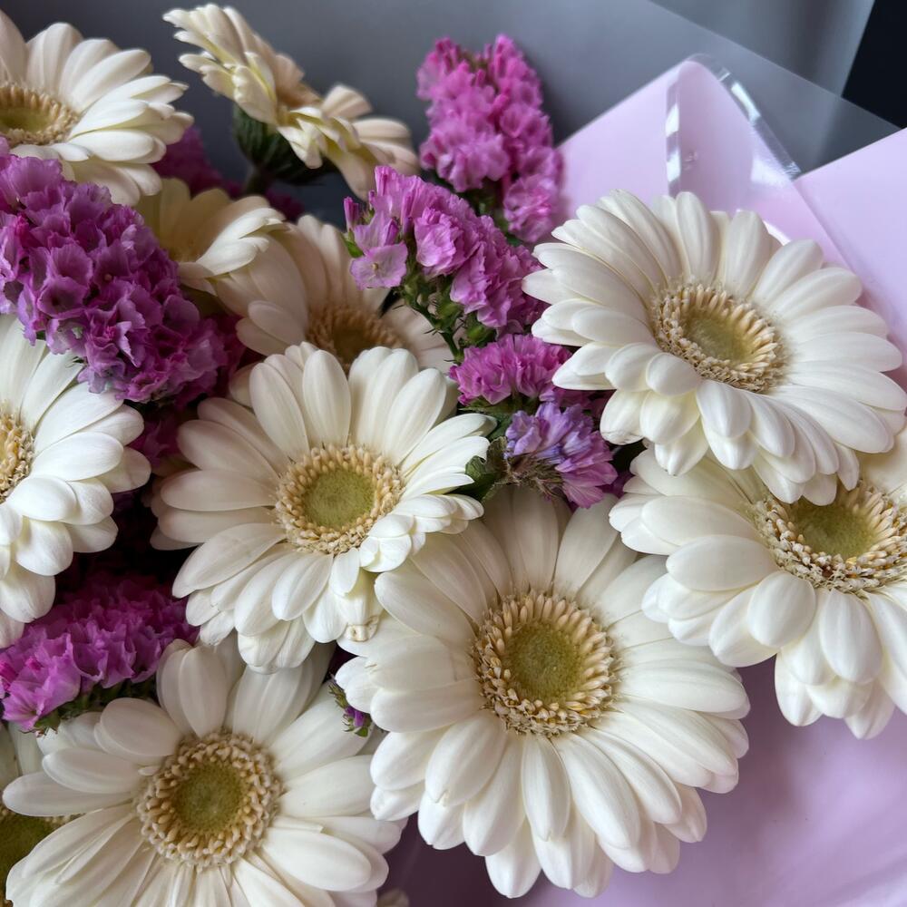 Гербера – 21 шт.Статица – 4 шт.декоративная упаковка – 1 шт.Атласная лента – 1 шт.