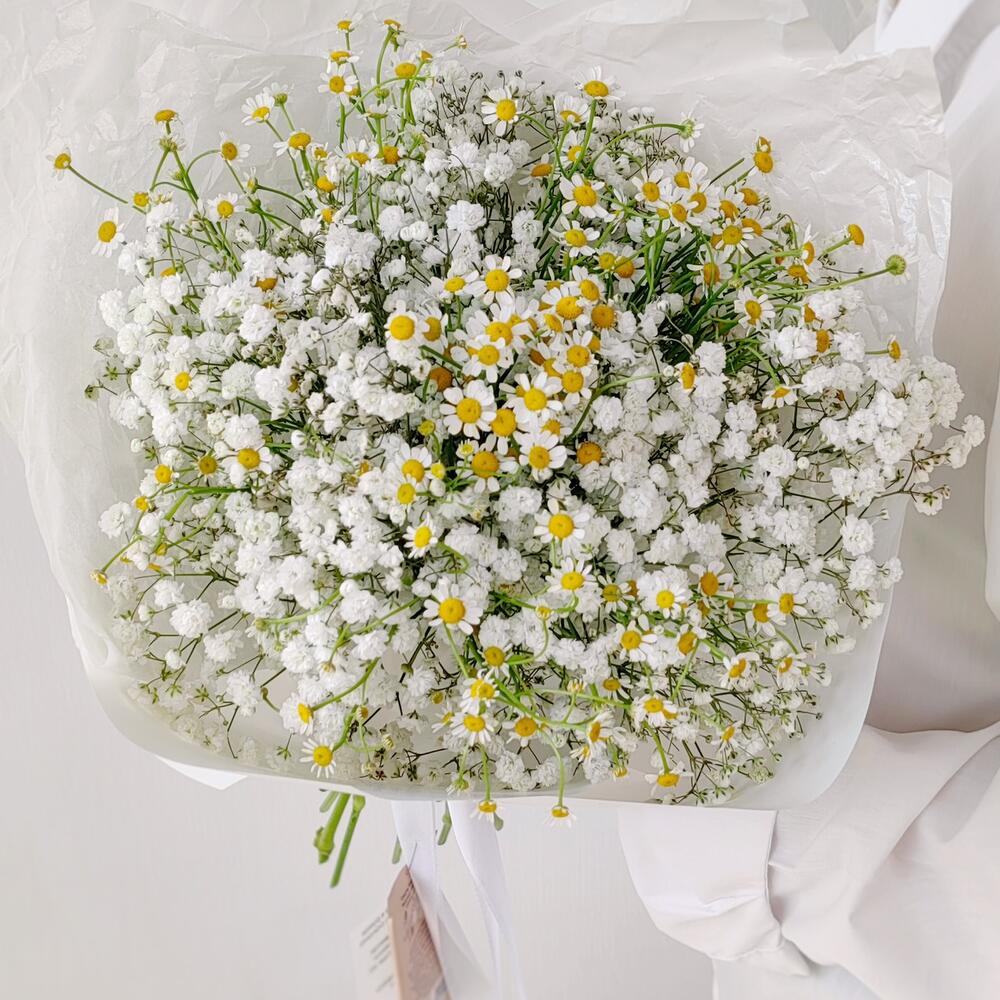 Лента атласная – 3 шт.Ромашка кустовая – 7 шт.Упаковка дизайнерская – 3 шт.гипсофила белая – 5 шт.