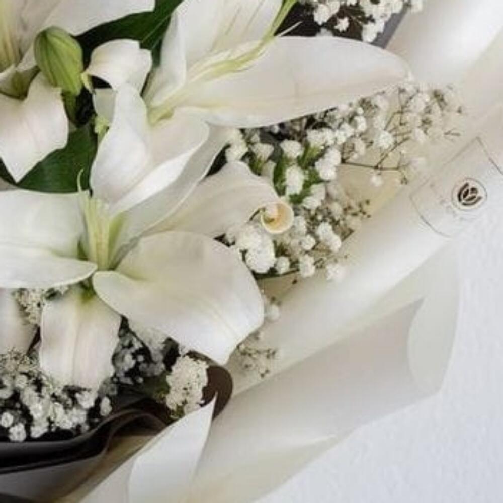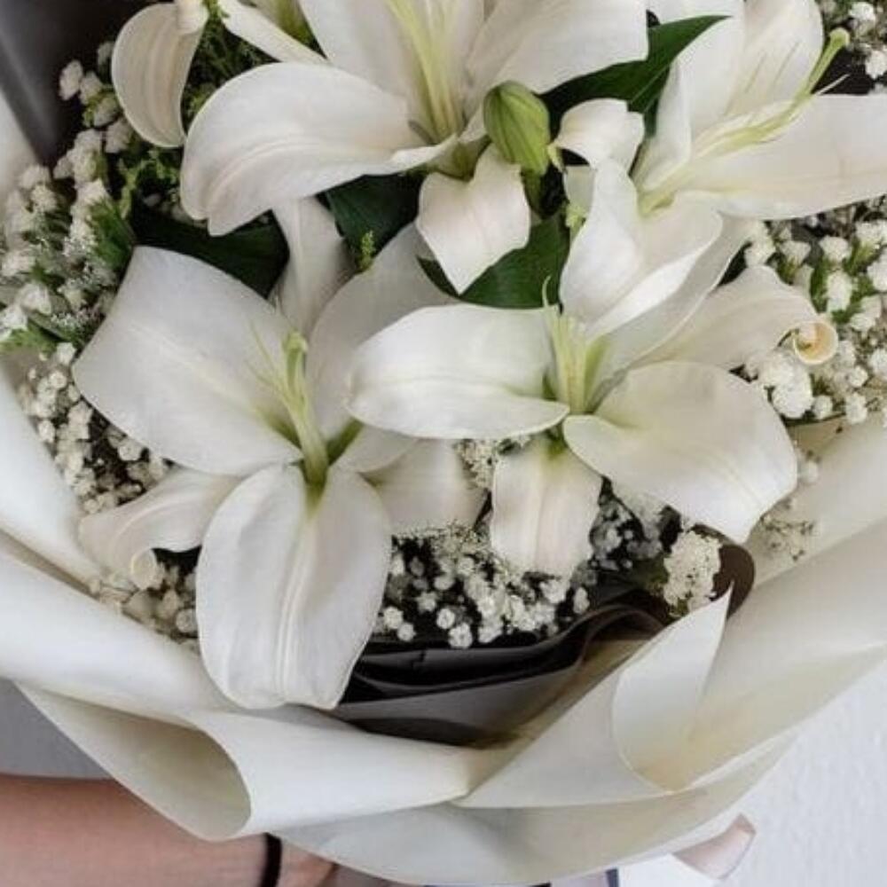 Лилия белая – 3 шт.Гипсофила – 3 шт.Фисташка пучок – 1 шт.Упаковка дизайнерская – 4 шт.