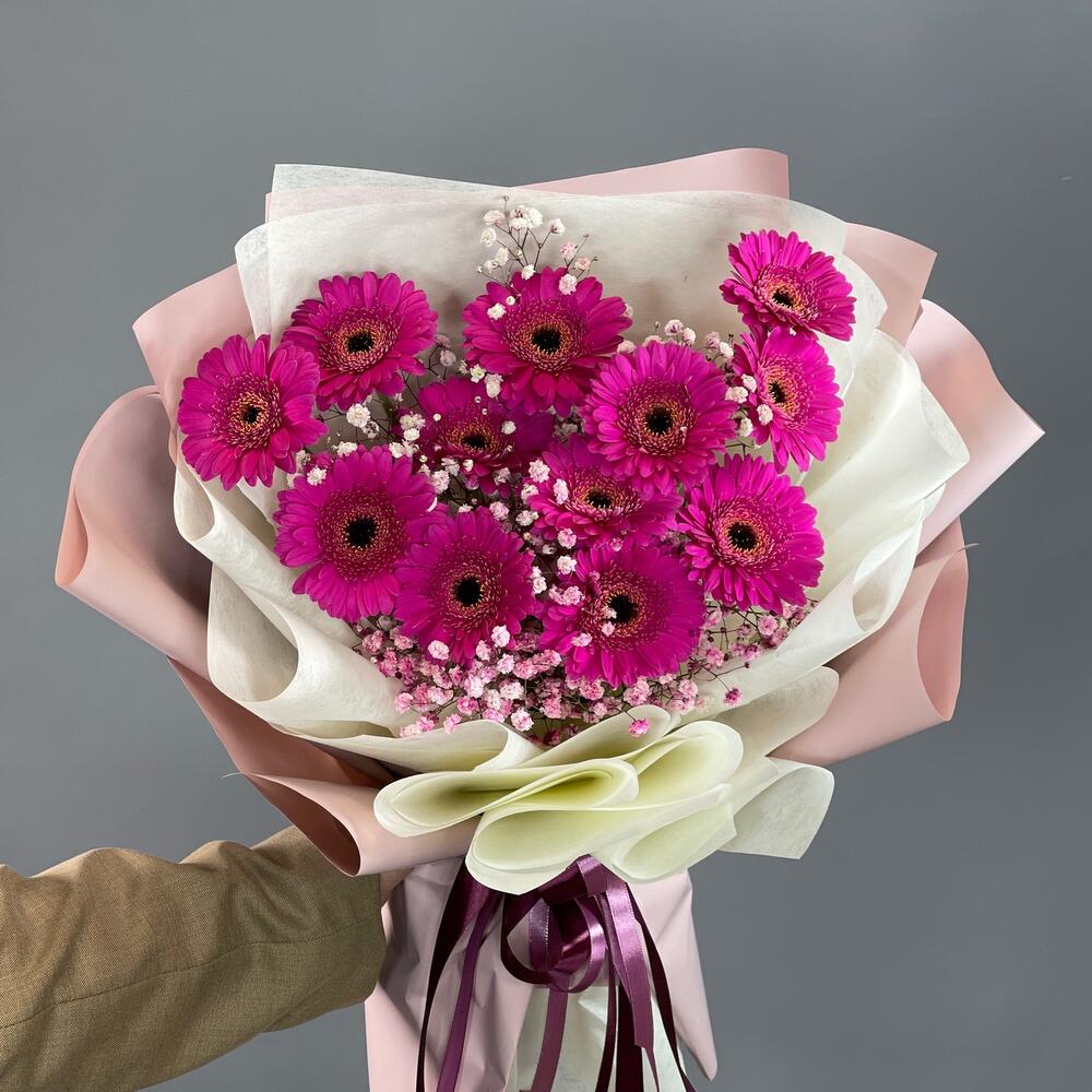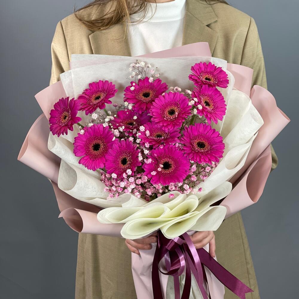 Гипсофила – 2 шт.Лента – 2 шт.Упаковка – 2 шт.Гербера мини – 11 шт.