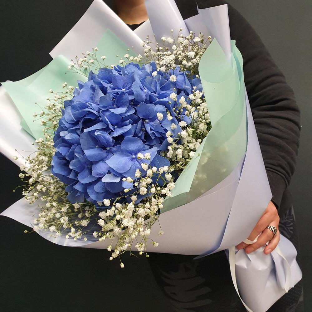 Гортензия – 1 шт.Гипсофила – 2 шт.Упаковка дизайнерская – 1 шт.Лента атласная – 1 шт.
