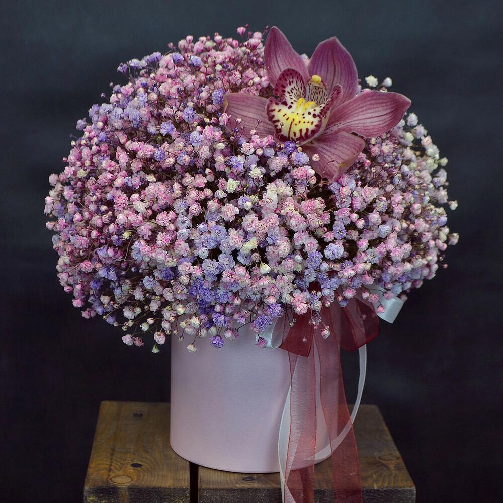 Шляпная коробка – 1 шт.орхидея – 1 шт.гипсофила разноцветная – 9 шт.