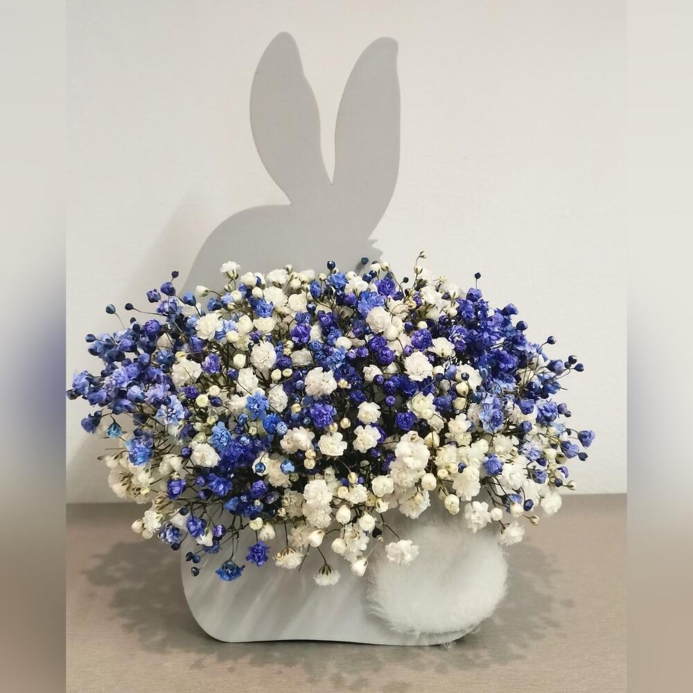 Оазис флористический – 1 шт.ящик “зайка” – 1 шт.гипсофила небесная и белая – 4 шт.