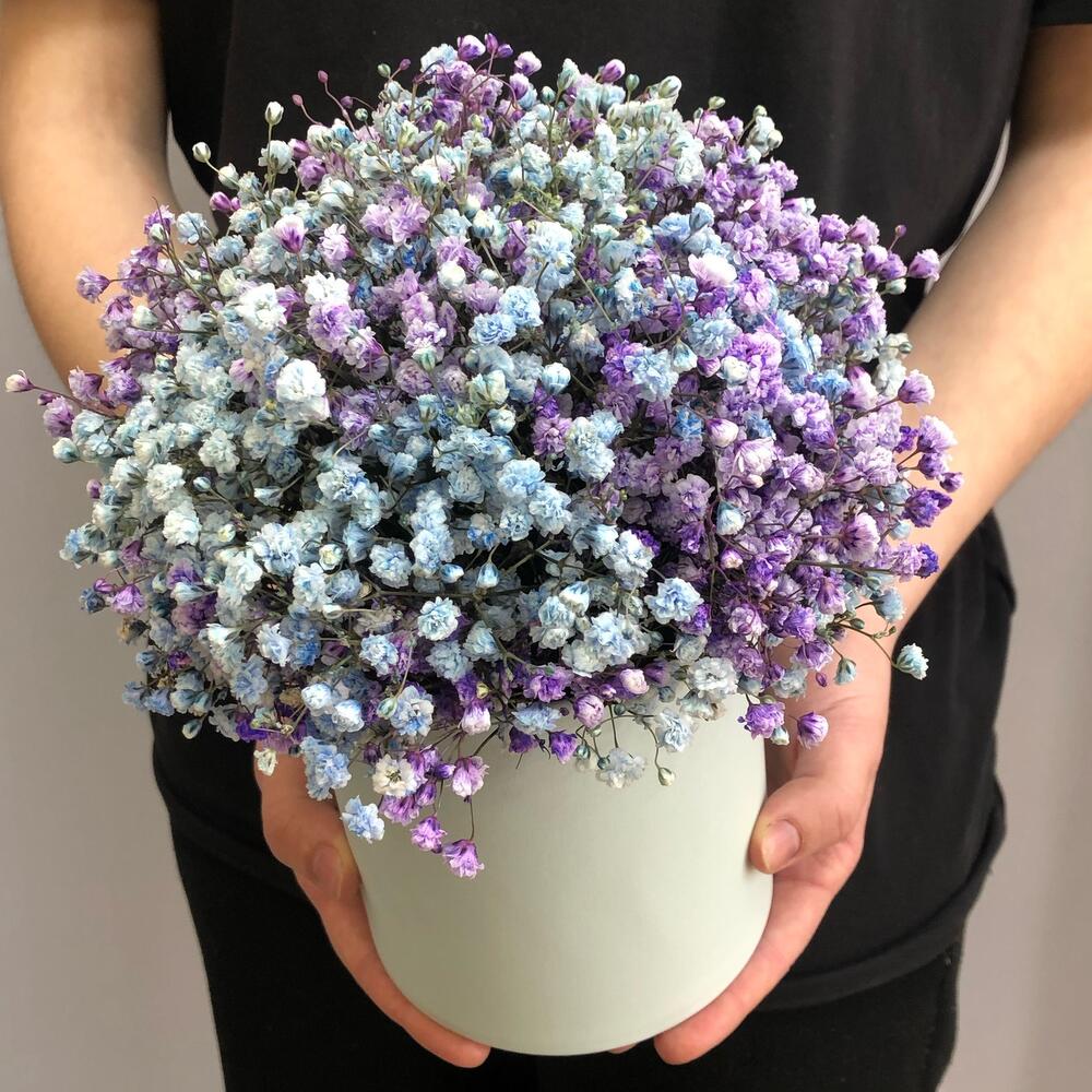 Композиция из гипсофилы в шляпной коробке «черника со льдом»