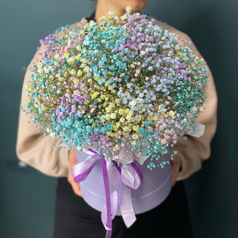Лента – 2 шт.Тишью – 1 шт.Коробка шляпная – 1 шт.Оазис флористический – 1 шт.Гипсофила крашеная – 9 шт.