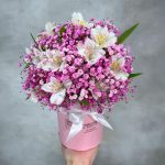 Коробочка из нежной розовой гипсофилы со стойкой изящной альстромерией. Стильная композиция для мамы, жены, подруги, любимой девушки, коллеги или партнёра по бизнесу.