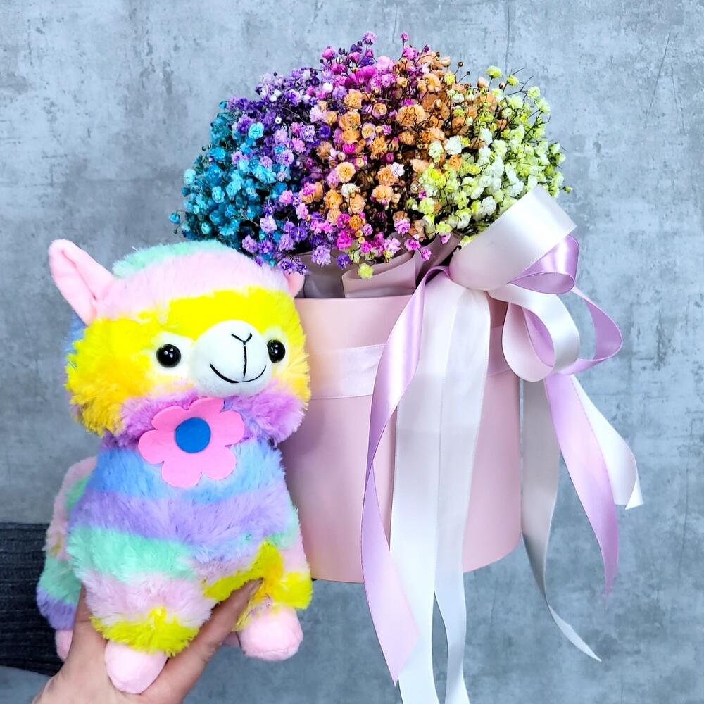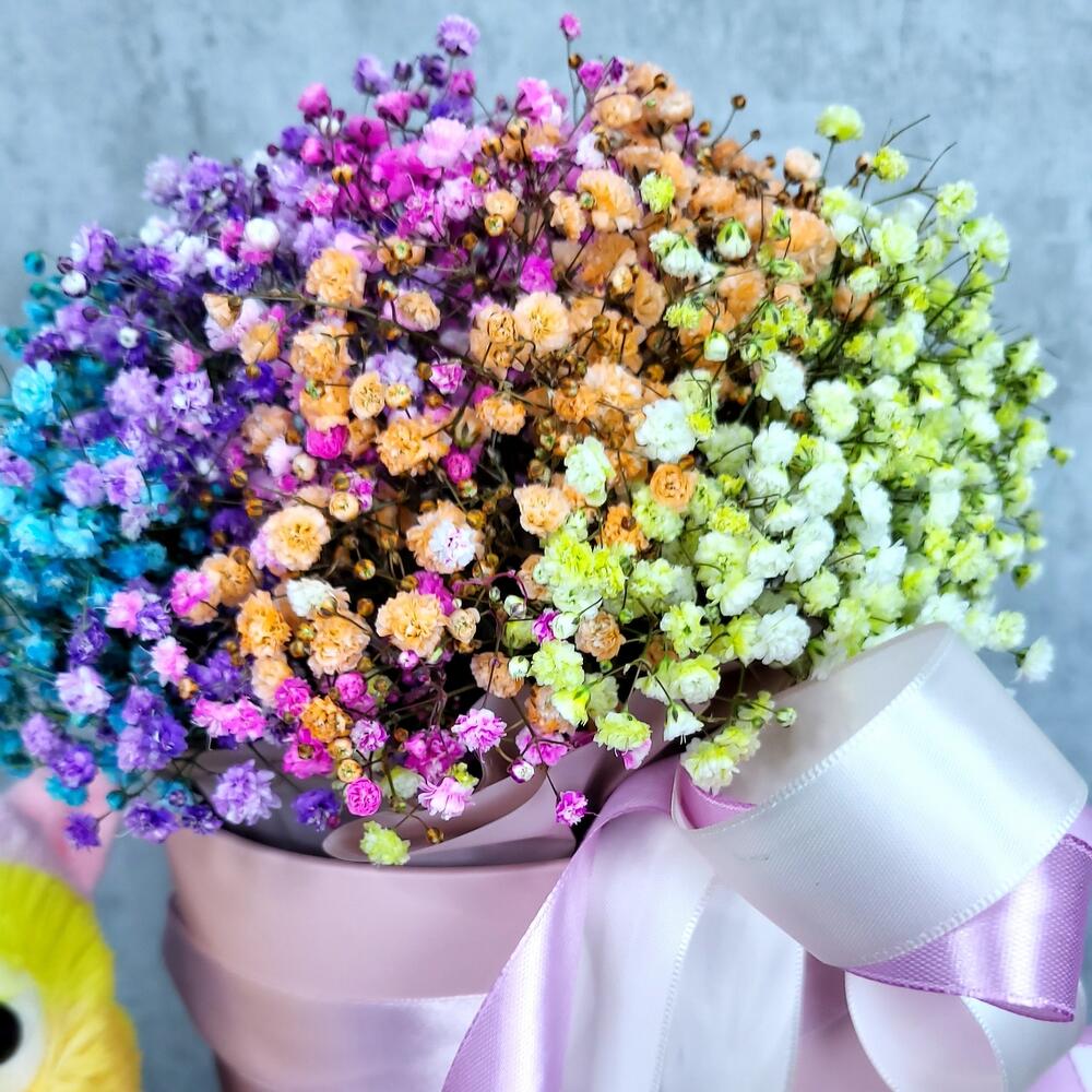 Гипсофила – 6 шт.Мягкая игрушка – 1 шт.Шляпная коробка – 1 шт.