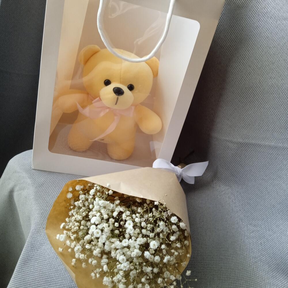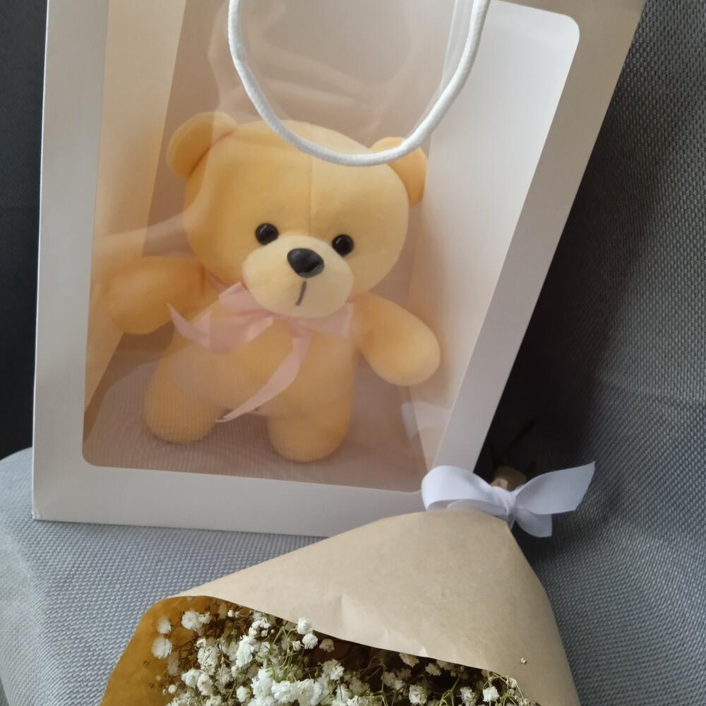 Мишка плюшевый – 1 шт.Гипсофила – 3 шт.Крафт упаковка – 1 шт.Лента – 1 шт.Пакет подарочный – 1 шт.