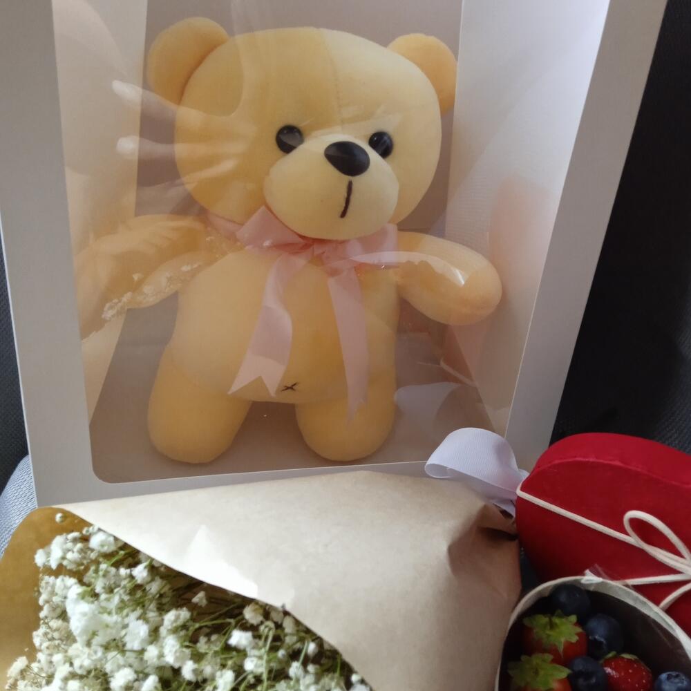 Мишка с ягодами и цветами в общей упаковке
