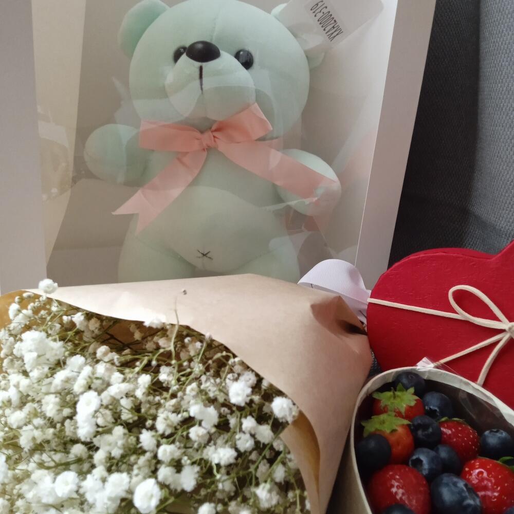 Гипсофила – 3 шт.Клубника – 250 гр.Лента – 1 шт.Голубика – 100 гр.Крафт упаковка – 1 шт.Пакет подарочный – 1 шт.Мишка плюшевый – 1 шт.коробка сердце маленькая – 1 шт.