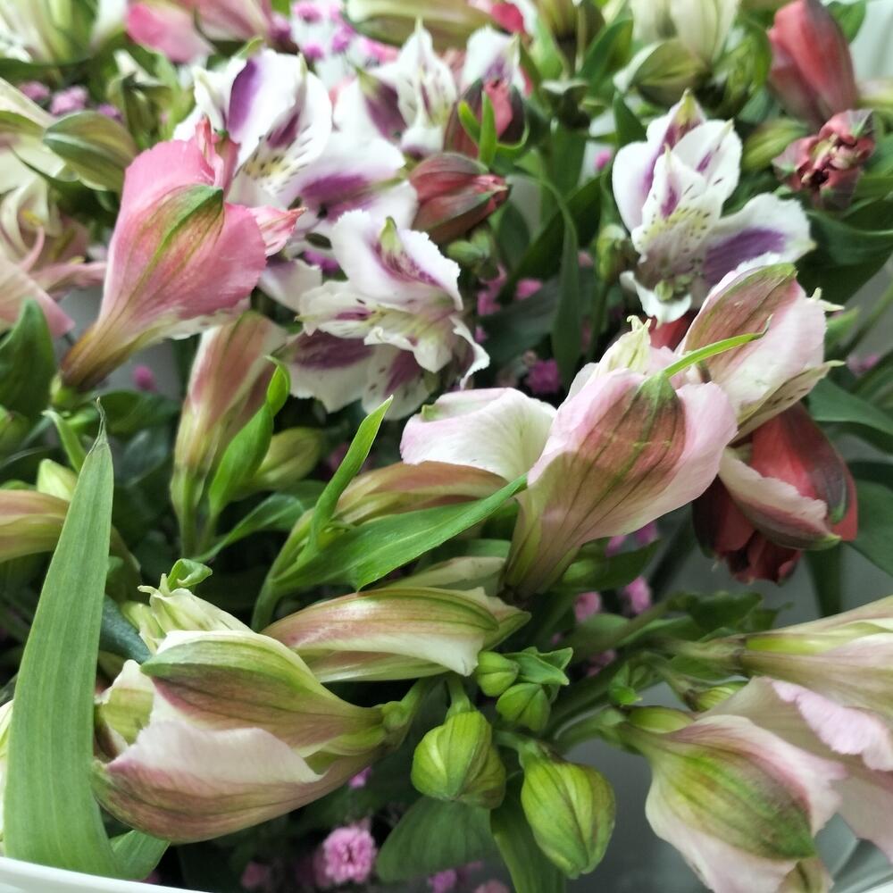 Лента атласная – 1 шт.Упаковка дизайнерская – 2 шт.Гипсофила розовая – 1 шт.альстромерия микс европа 70 см – 15 шт.