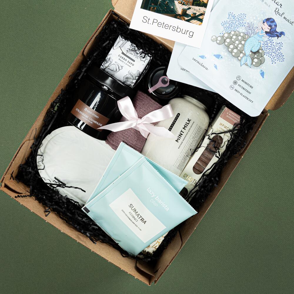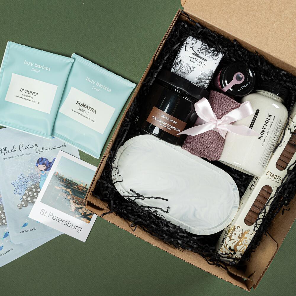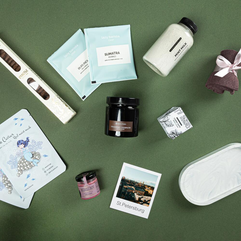 декоративная подставка для украшений из гипсофила – 1 шт.брендовая свеча bbox.studio с деревянным фитилем – 1 шт.ириски “счастье” – 1 шт.молочко для ванной laboratorium – 1 шт.дрип-кофе – 2 шт.тканевая маска для лица – 2 шт.носочки универсального размера – 1 шт.Мед-суфле – 1 шт.