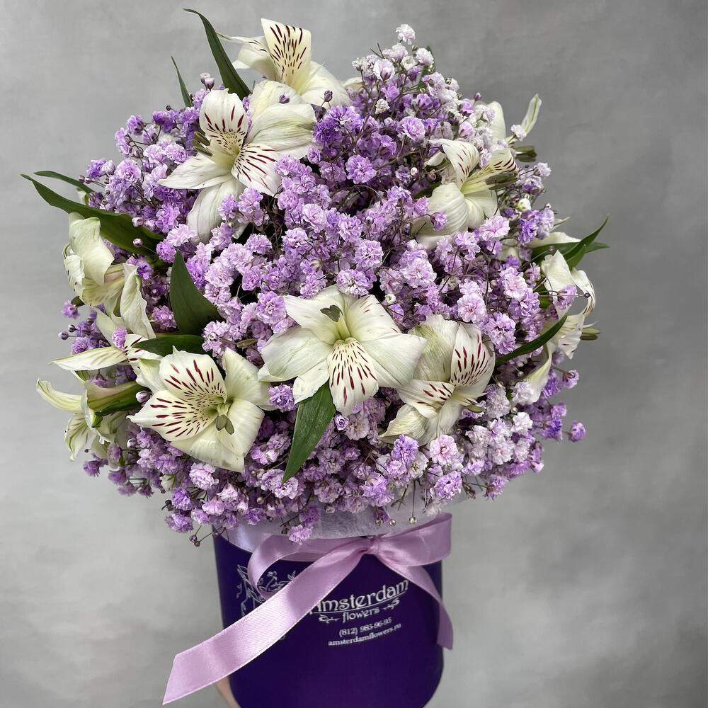 Альстромерия – 5 шт. Коробка шляпная – 1 шт. Оазис флористический – 1 шт. гипсофила сиреневая – 5 шт.