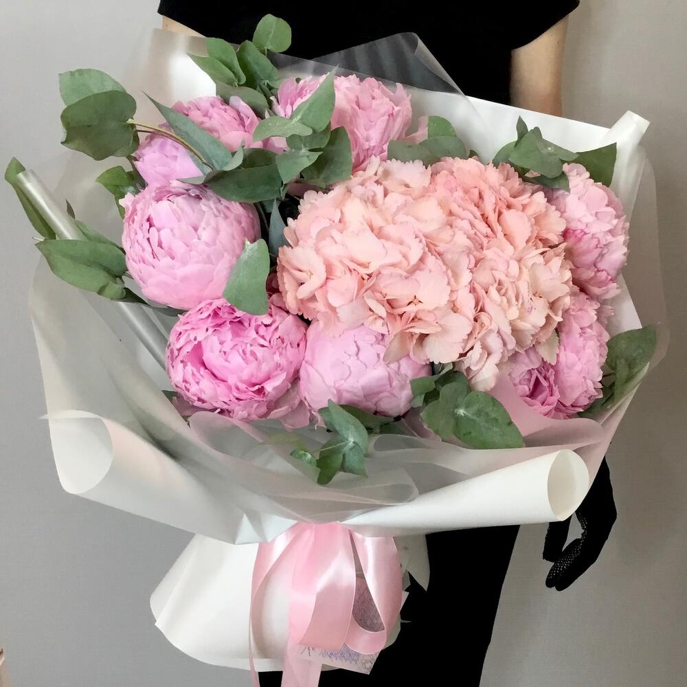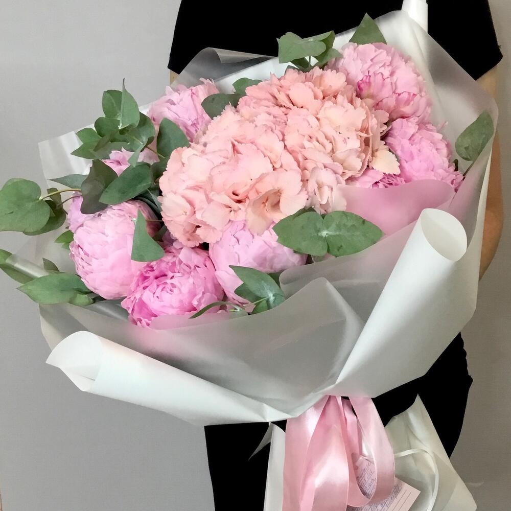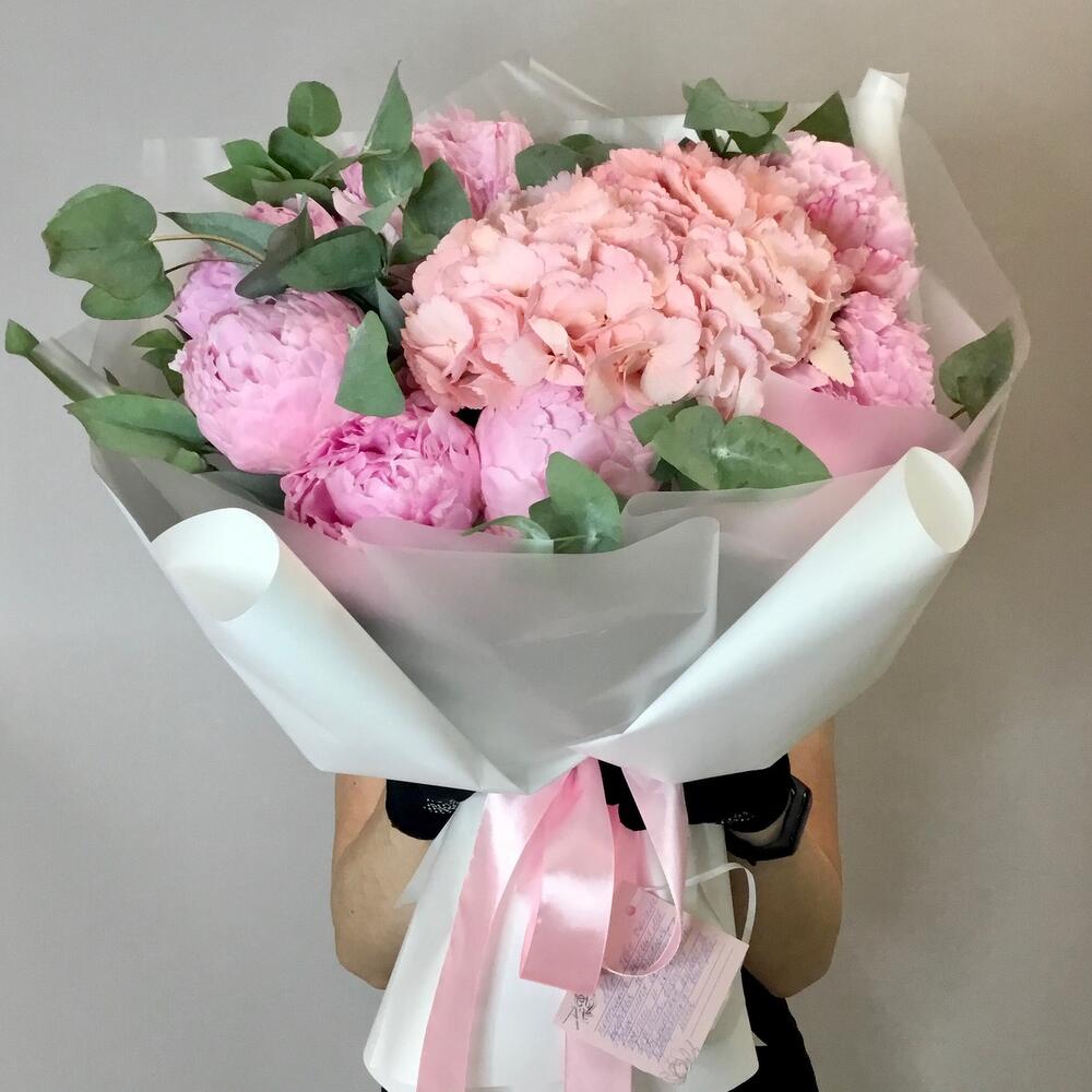 Гортензия – 1 шт.Эвкалипт – 4 шт.Лента атласная – 1 шт.Пленка матовая – 2 шт.Пион Голландия – 8 шт.