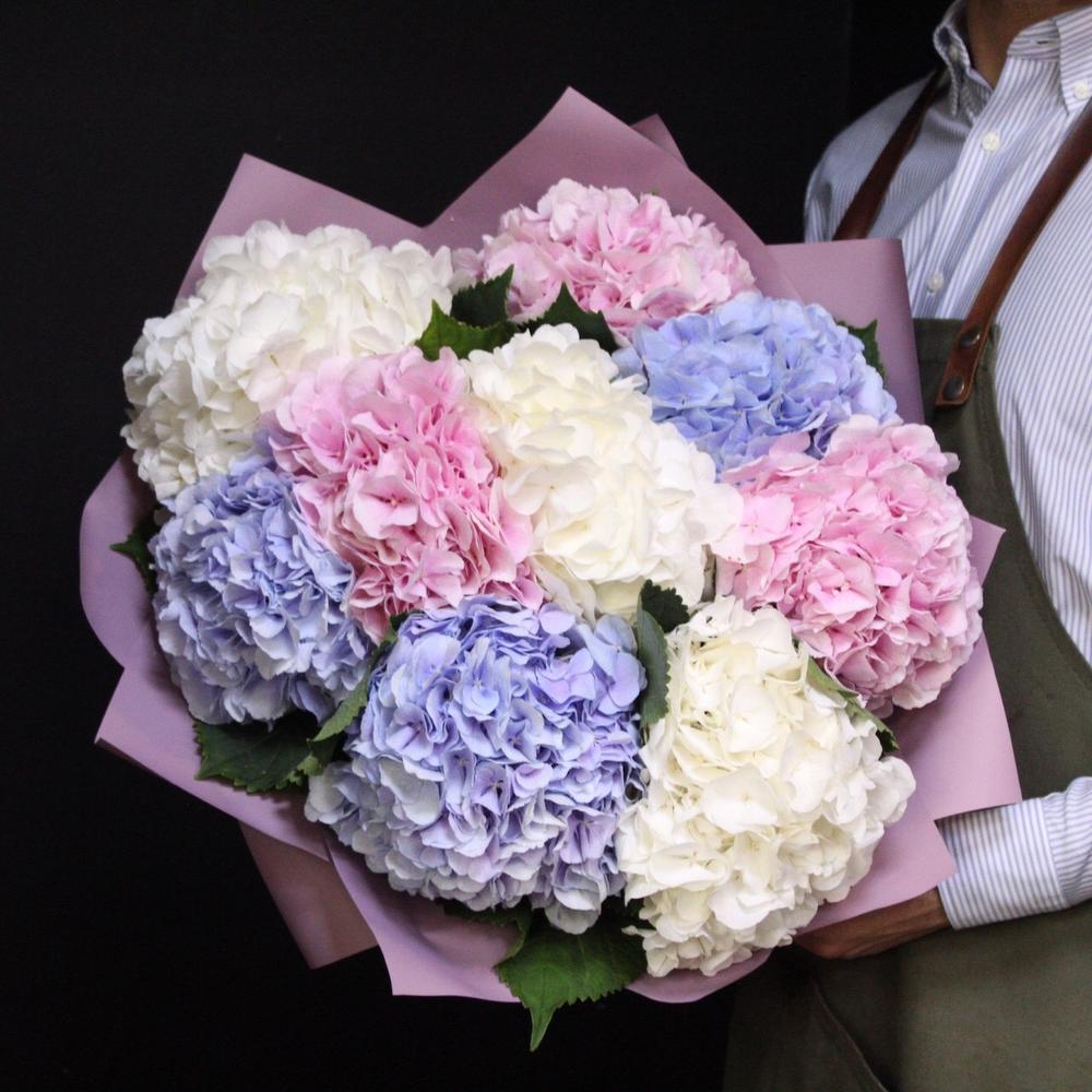 Гортензия – 9 шт.Пленка дизайнерская – 3 шт.Лента атласная – 2 шт.