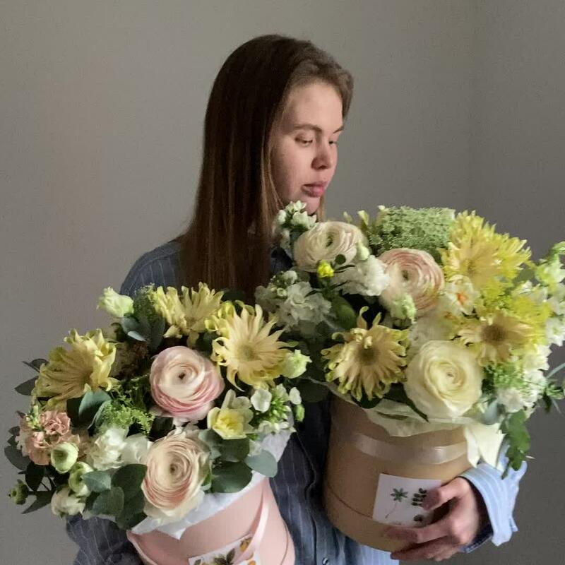 гербера кучерявая – 5 шт.Ранункулюс – 5 шт.Амми – 3 шт.Маттиола – 3 шт.Нарцисс – 2 шт.Лизиантус – 3 шт.Гвоздика – 6 шт.Гринбелл – 2 шт.Эвкалипт – 5 шт.Фисташка – 2 шт.Оазис флористический – 1 шт.Коробка шляпная – 1 шт.