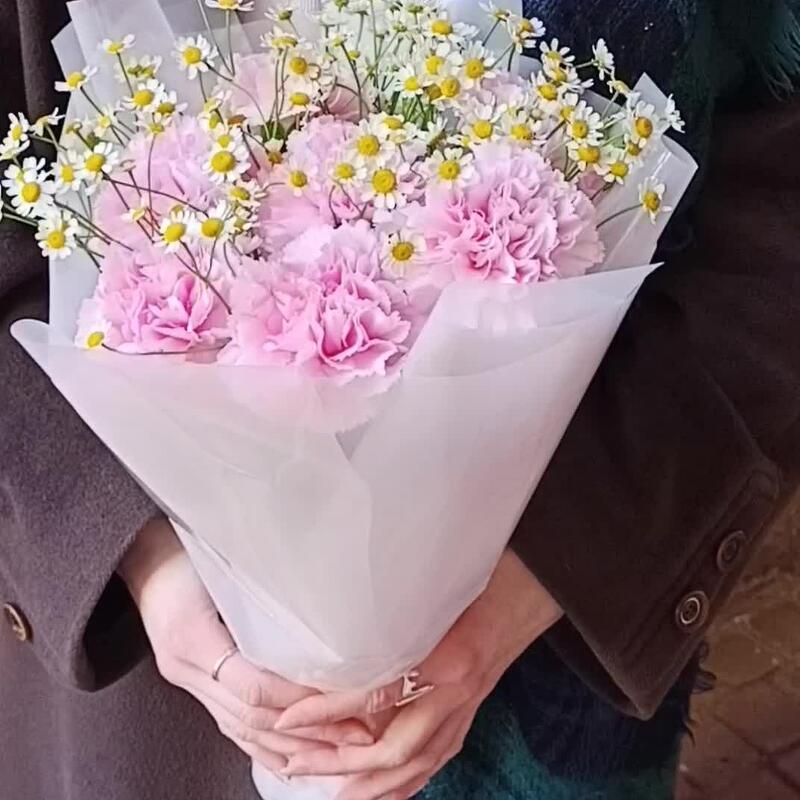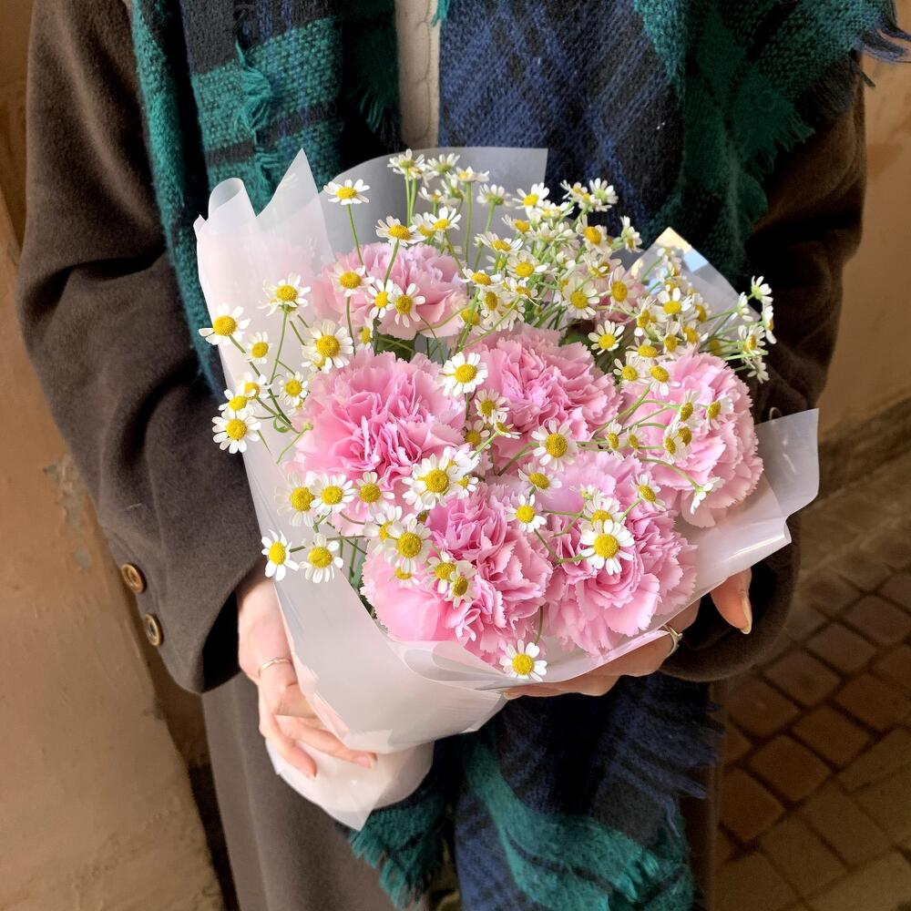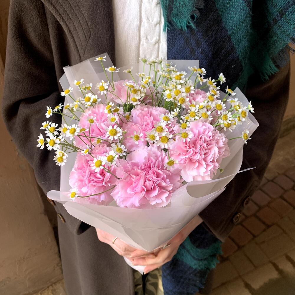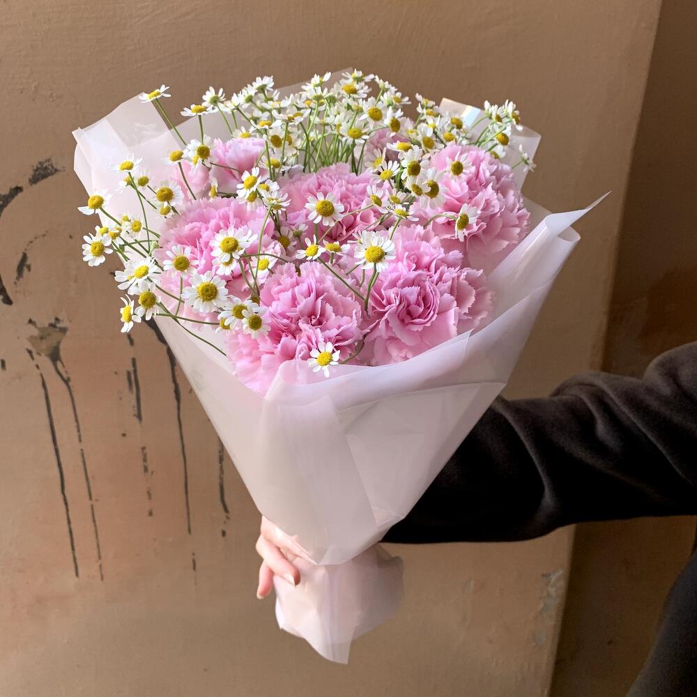 Гвоздика розовая – 7 шт.Матрикария – 4 шт.авторска упаковка – 1 шт.