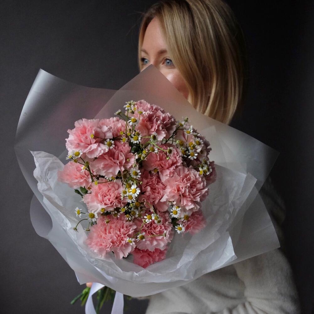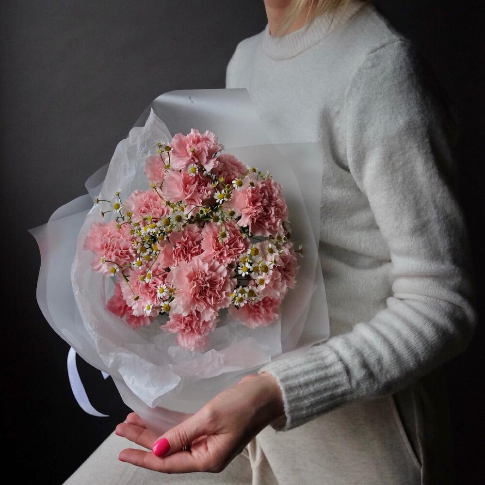 Лента атласная – 1 шт.Диантус – 15 шт.Матрикария – 5 шт.Упаковка дизайнерская – 1 шт.Открыточка с вашими пожеланиями – 1 шт.