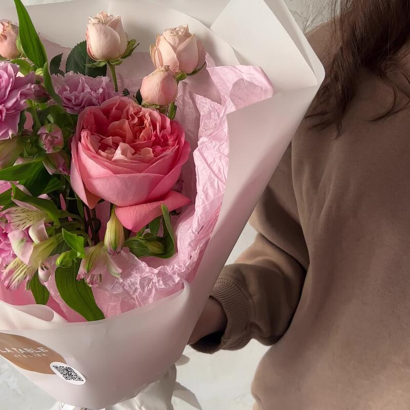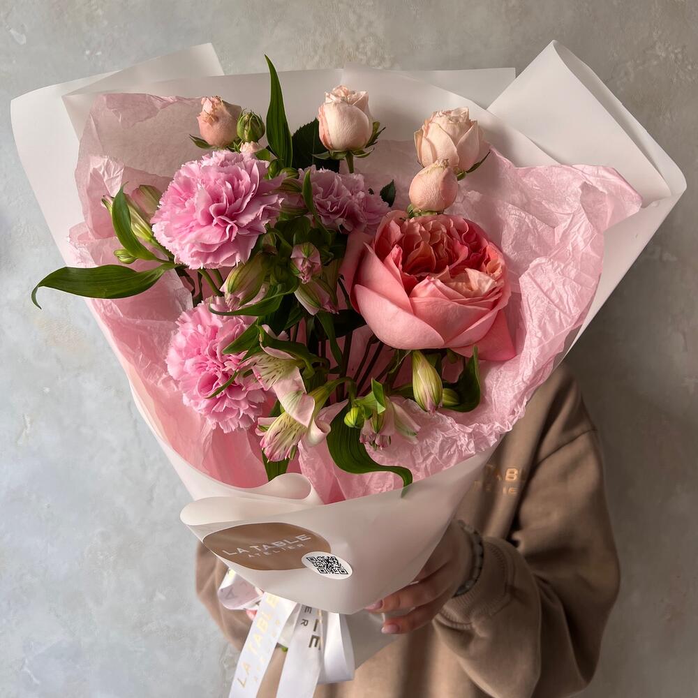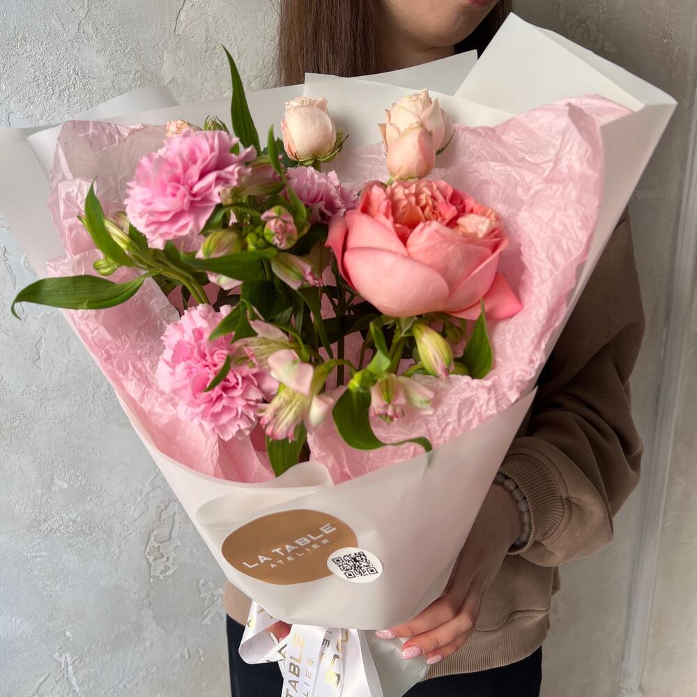Роза кустовая пионовидная – 1 шт.Пионовидная роза – 1 шт.Альстромерия – 2 шт.Гвоздика – 2 шт.Упаковка дизайнерская – 1 шт.