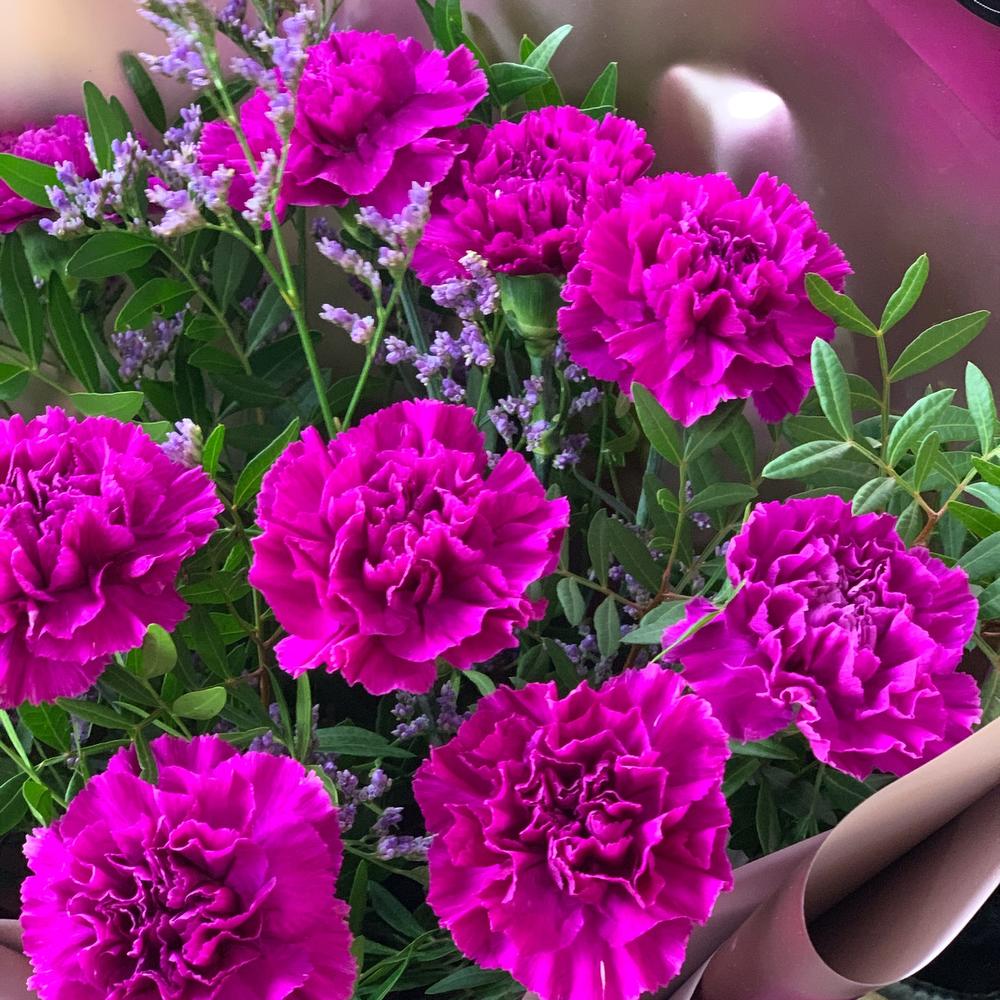 Гвоздика – 11 шт.Лимониум – 1 шт.зелень декоративная – 1 шт.Упаковка дизайнерская – 1 шт.Лента атласная – 1 шт.
