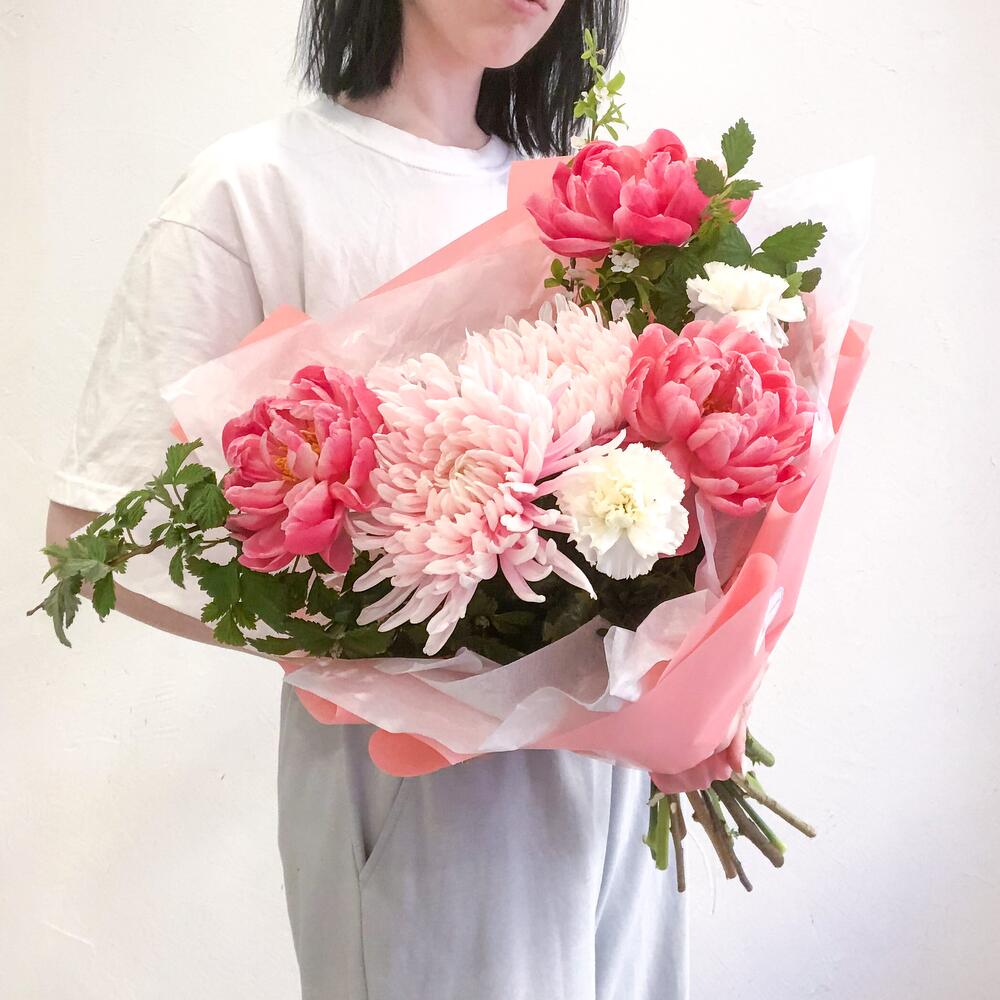 Букет с пионами и хризантемой в дизайнерском оформлении