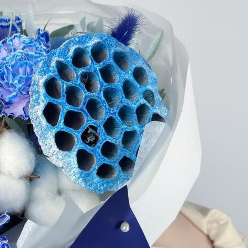 Гвоздика – 7 шт.Хлопок натуральный – 8 шт.Лагурус (сухоцвет) – 7 шт.Лотос (коробочка) – 1 шт.Тишью – 2 шт.Пленка матовая – 2 шт.