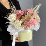 Альстромерия – 3 шт.Гвоздика – 9 шт.Лента атласная – 1 шт.Тишью – 1 шт.Сухоцветы – 3 шт.Шляпная коробка – 1 шт.Оазис флористический – 1 шт.