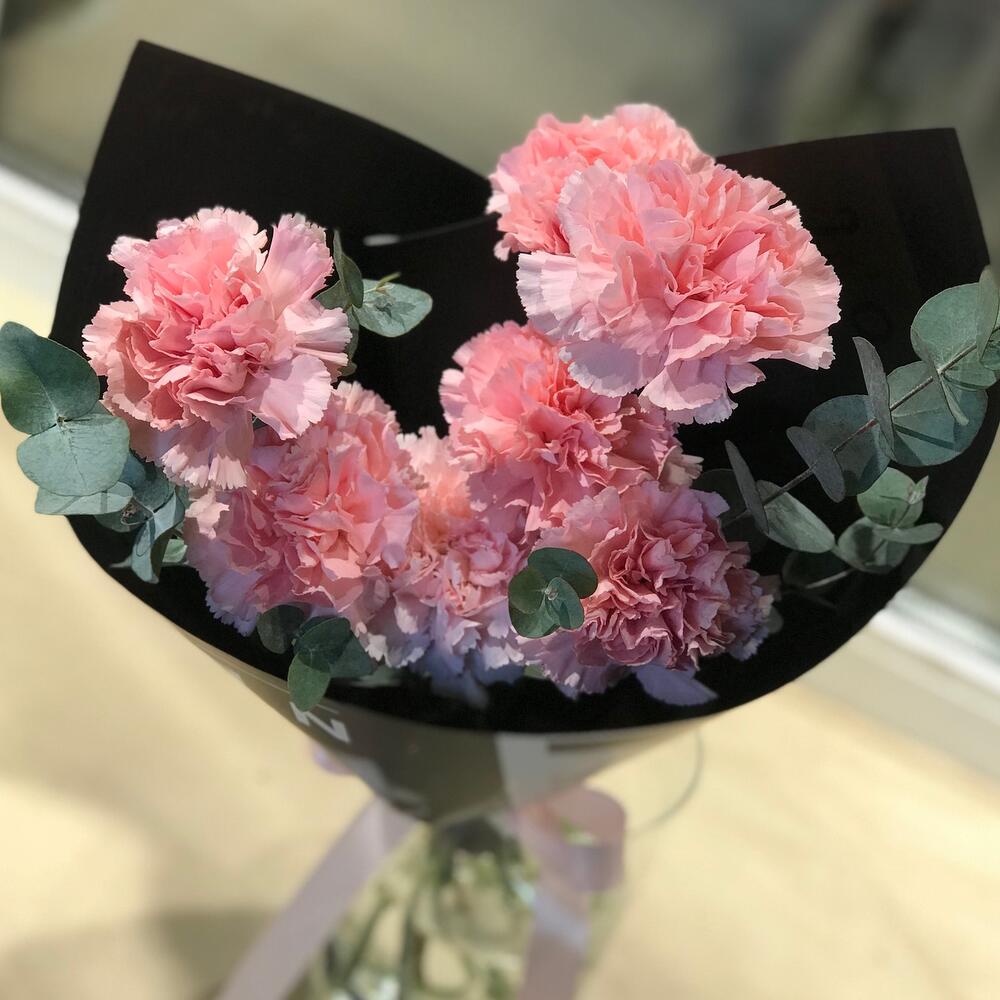 Диантус – 7 шт.Эвкалипт – 2 шт.Упаковка дизайнерская – 1 шт.Лента атласная – 1 шт.Средство для продления жизни цветов – 1 шт.