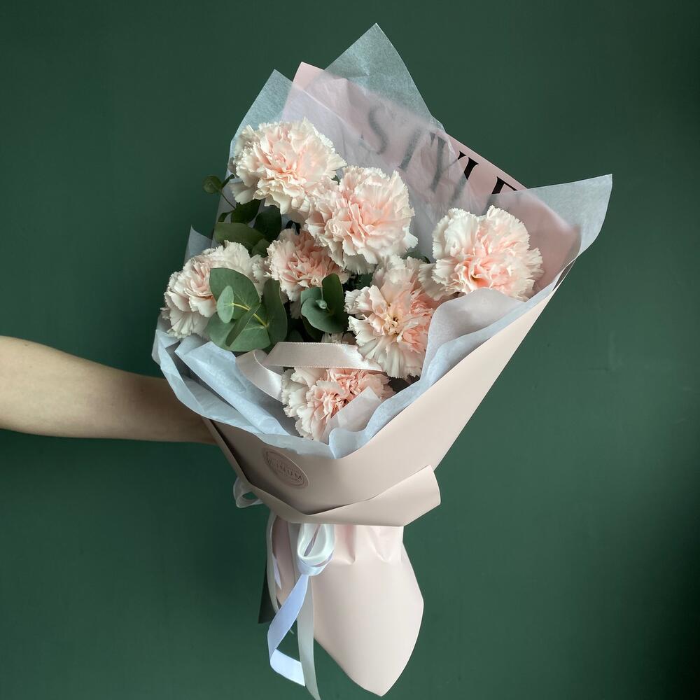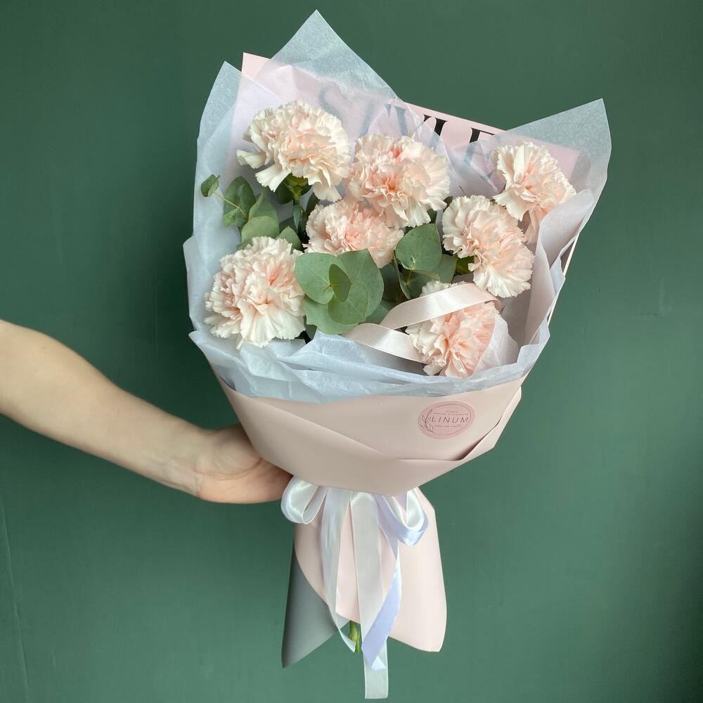 Эвкалипт – 1 шт.Упаковка дизайнерская – 1 шт.Открыточка с вашими пожеланиями – 1 шт.гвоздики – 7 шт.транспортировочная упаковка – 1 шт.уходовое средство для цветов – 1 шт.