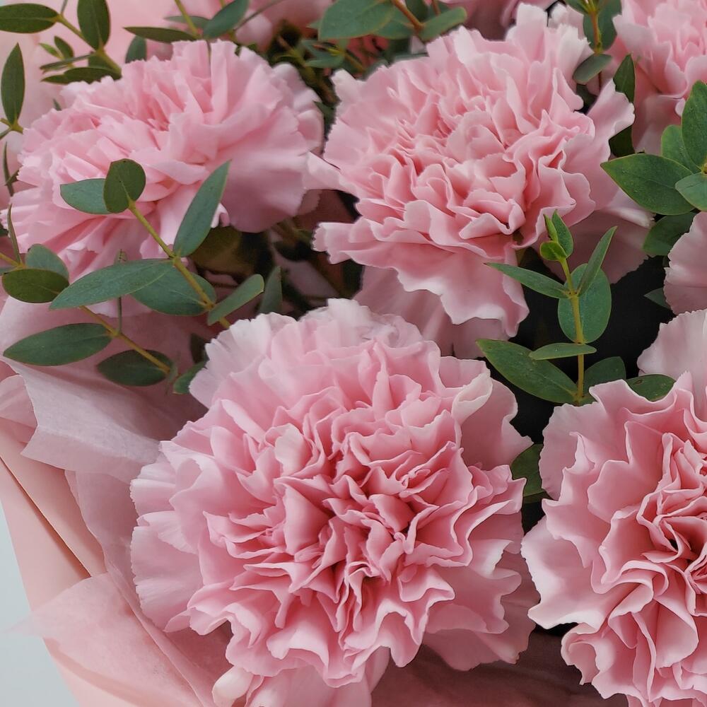 гвоздика сортовая (диантус) – 21 шт.Эвкалипт – 15 шт.Пистация – 10 шт.Упаковка тишью – 8 шт.Упаковка пленка матовая – 7 шт.Лента атласная – 1 шт.