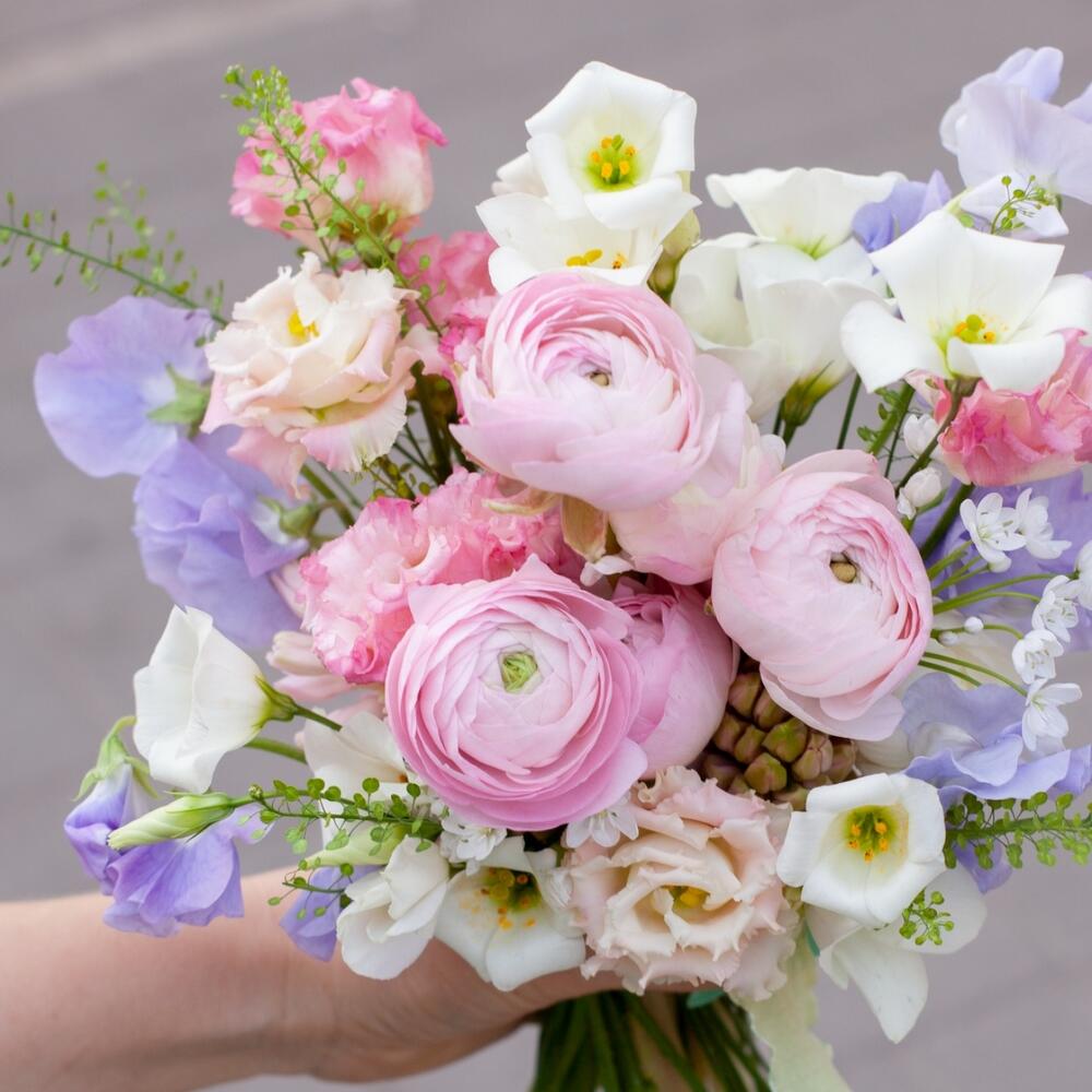Нежный букет с латирусом и ранункулюсами в корейском стиле