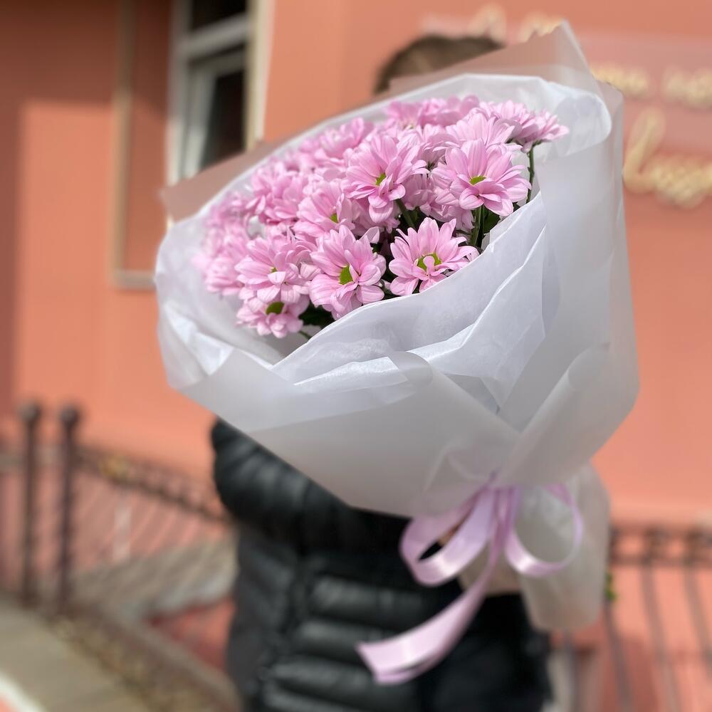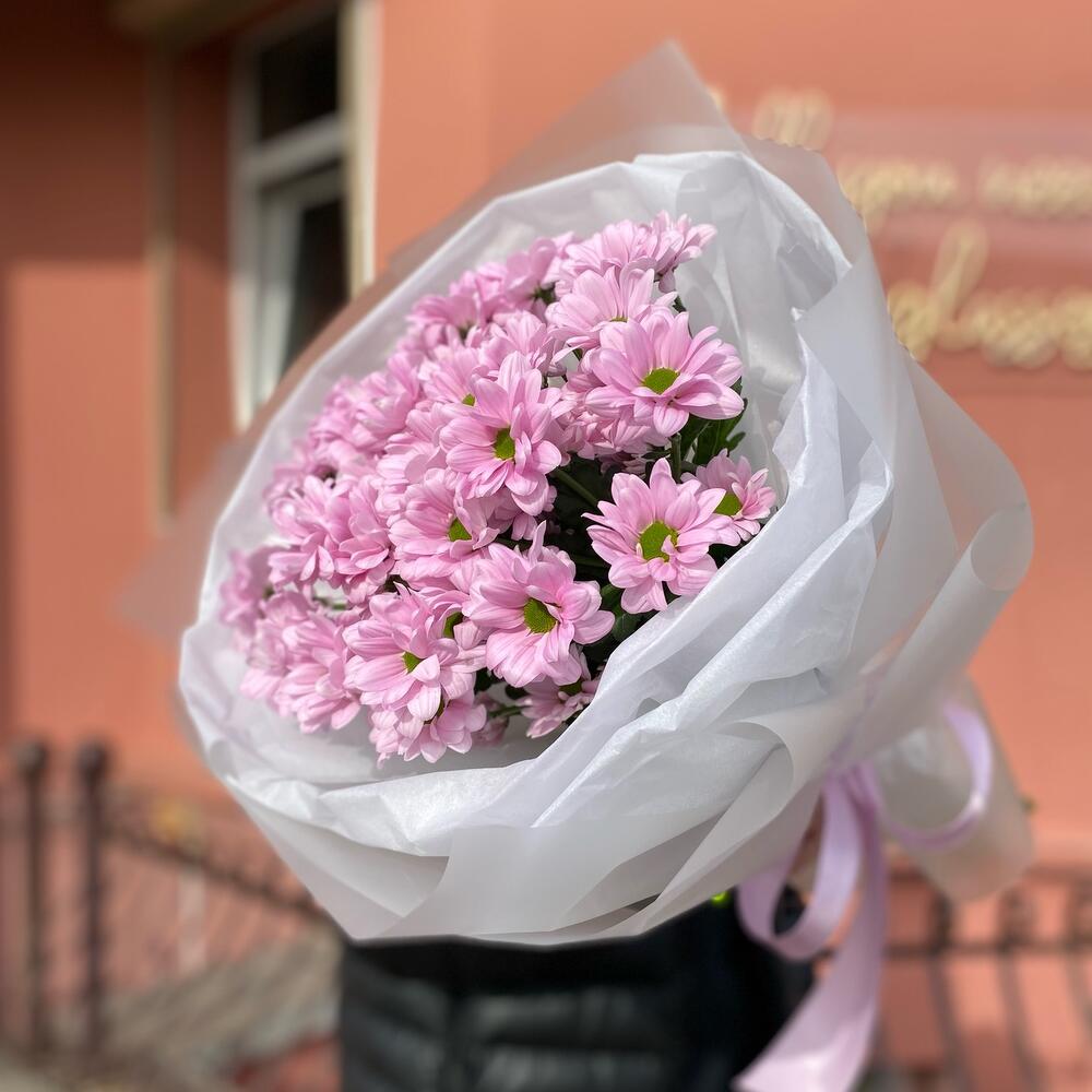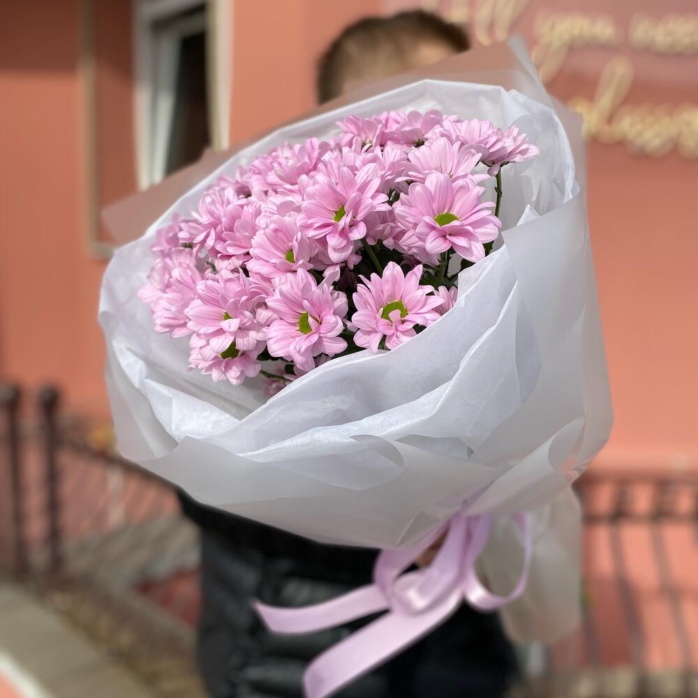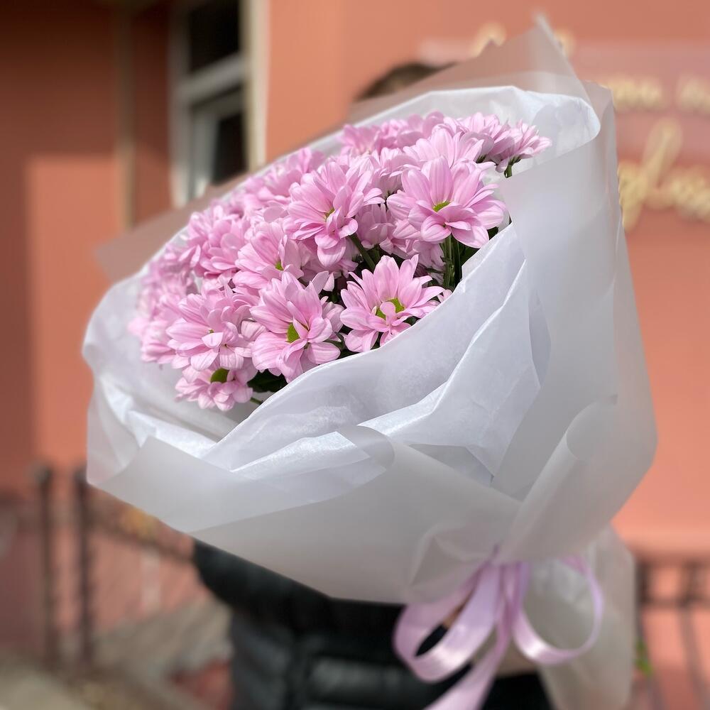 Букет из 5 веток ромашковых хризантем в дизайнерском оформлении, количество ромашек в букете может достигать 51 штуки .