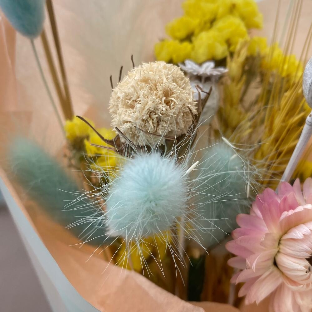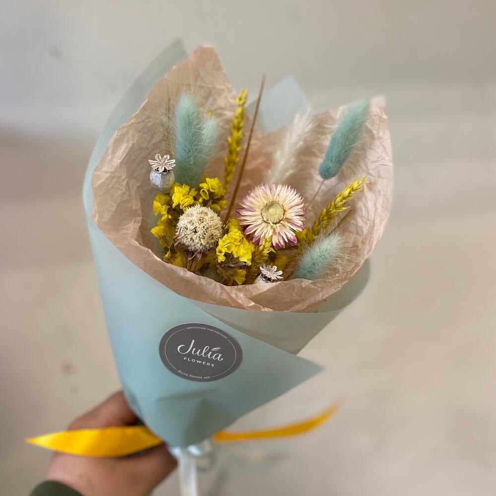 Скабиоза – 1 шт.Статица – 3 шт.Лагурус – 5 шт.Гелихризум – 1 шт.Пшеница (сухоцвет) – 2 шт.мак коробка – 2 шт.