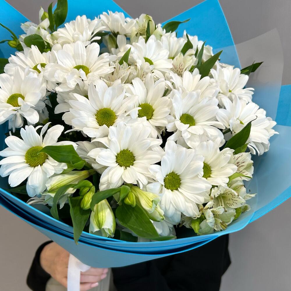 Альстромерия – 6 шт.Хризантема кустовая – 5 шт.Лента атласная – 2 шт.Упаковка дизайнерская – 2 шт.